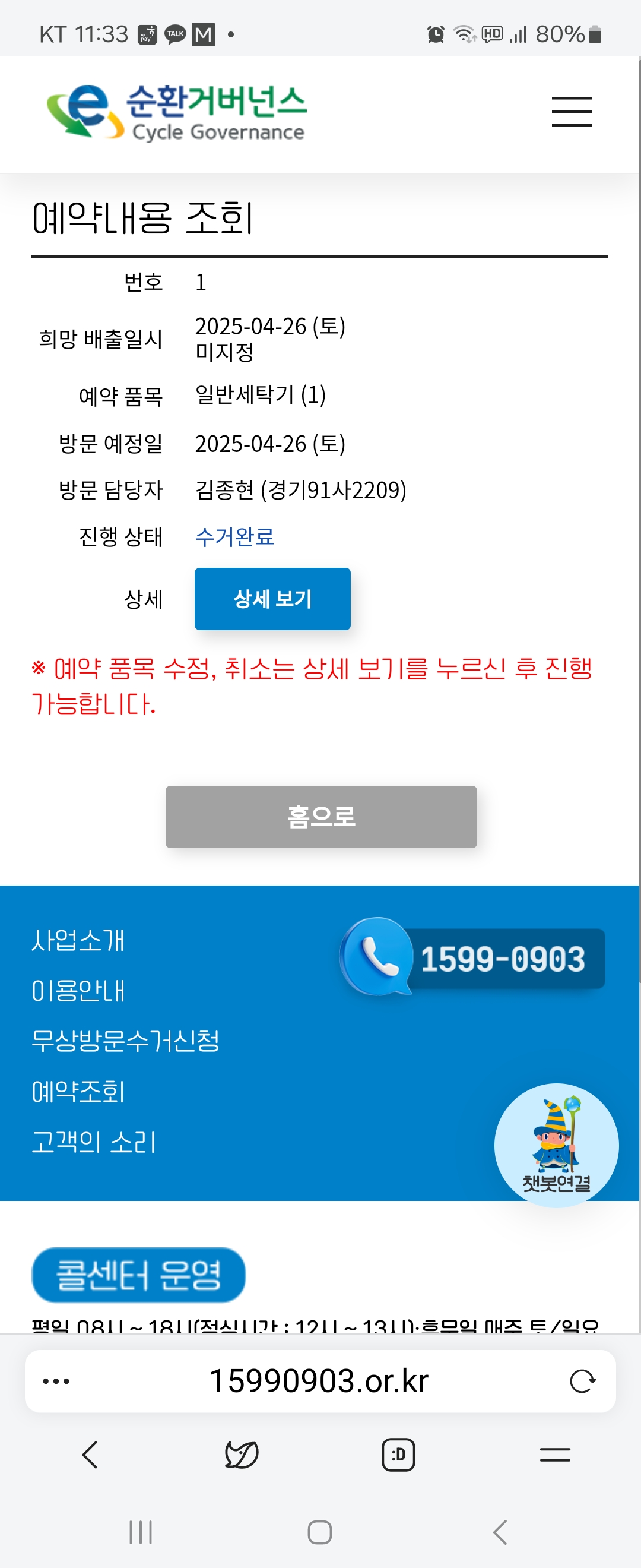 세탁기 수거신청완료!