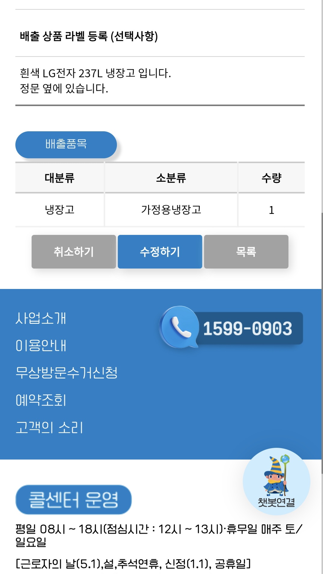 폐냉장고 무상 방문 수거 신청 했습니다.