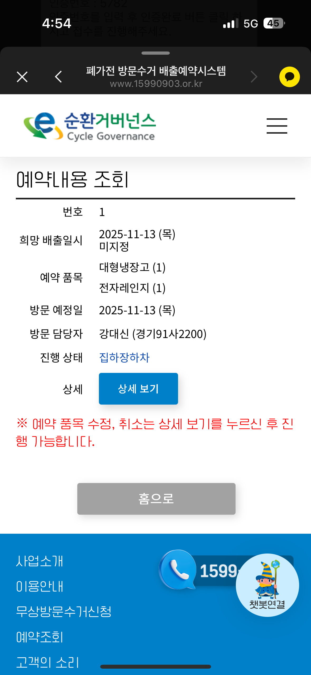 냉장고 폐가전 수거 요청 완료