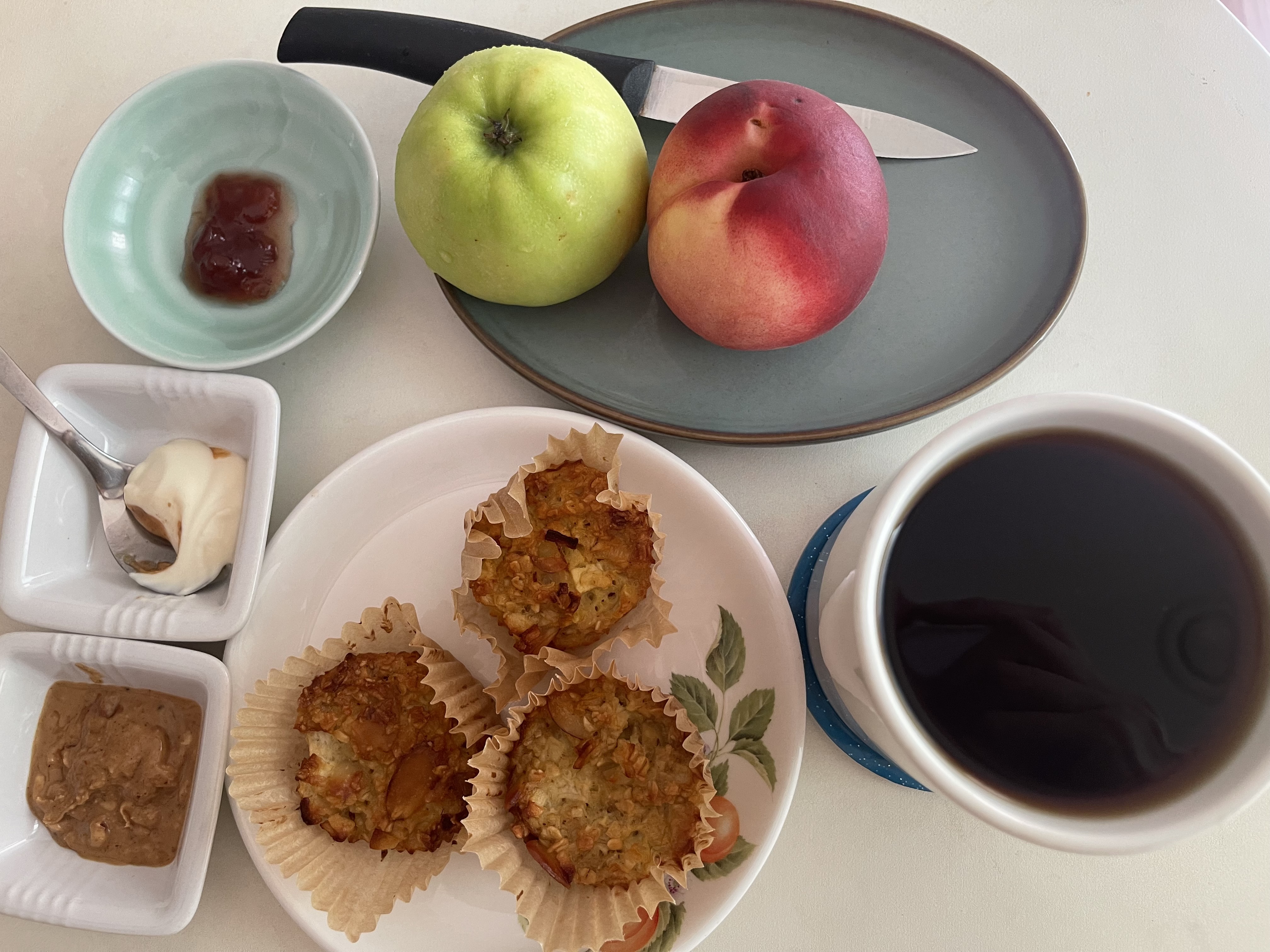 딸기잼, 발라먹는 브리치즈, 땅콩버터 그리고 커피