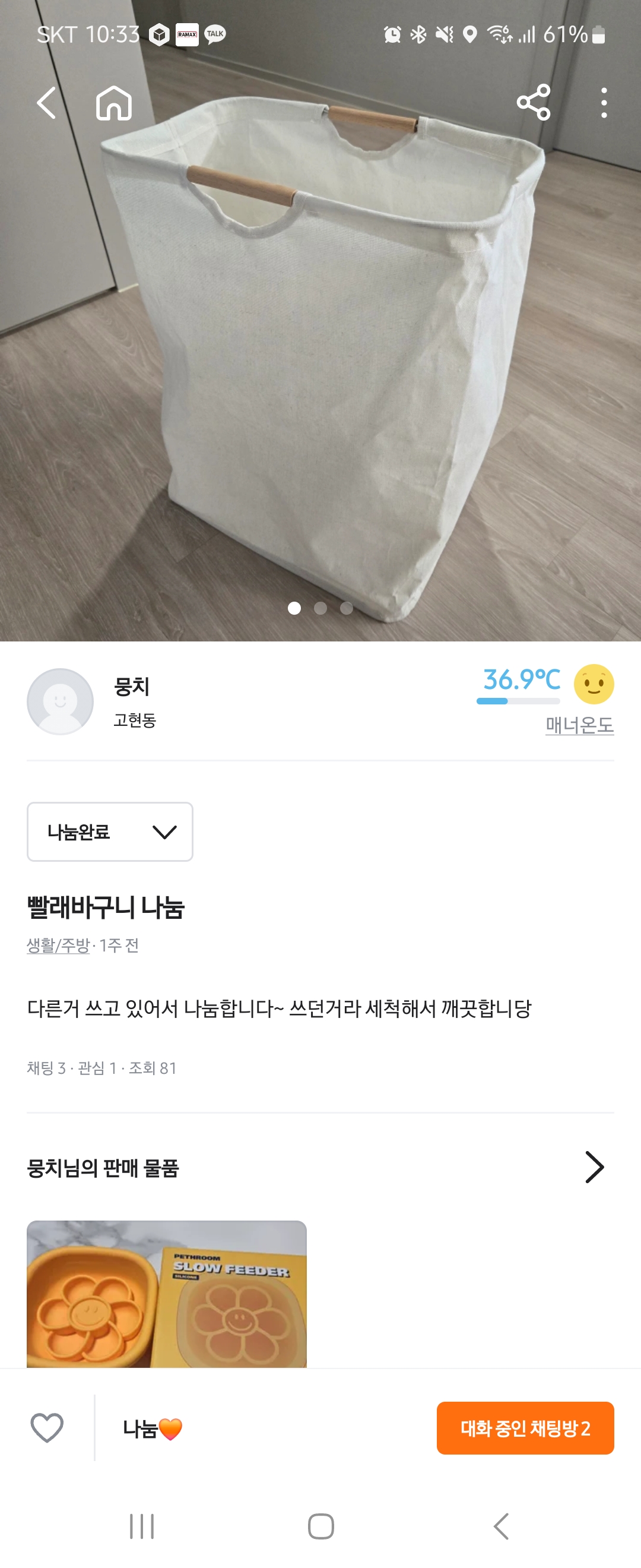 사용하지않는 빨래바구니 중고거래해서 필요하신 분께 나눔했습니다
