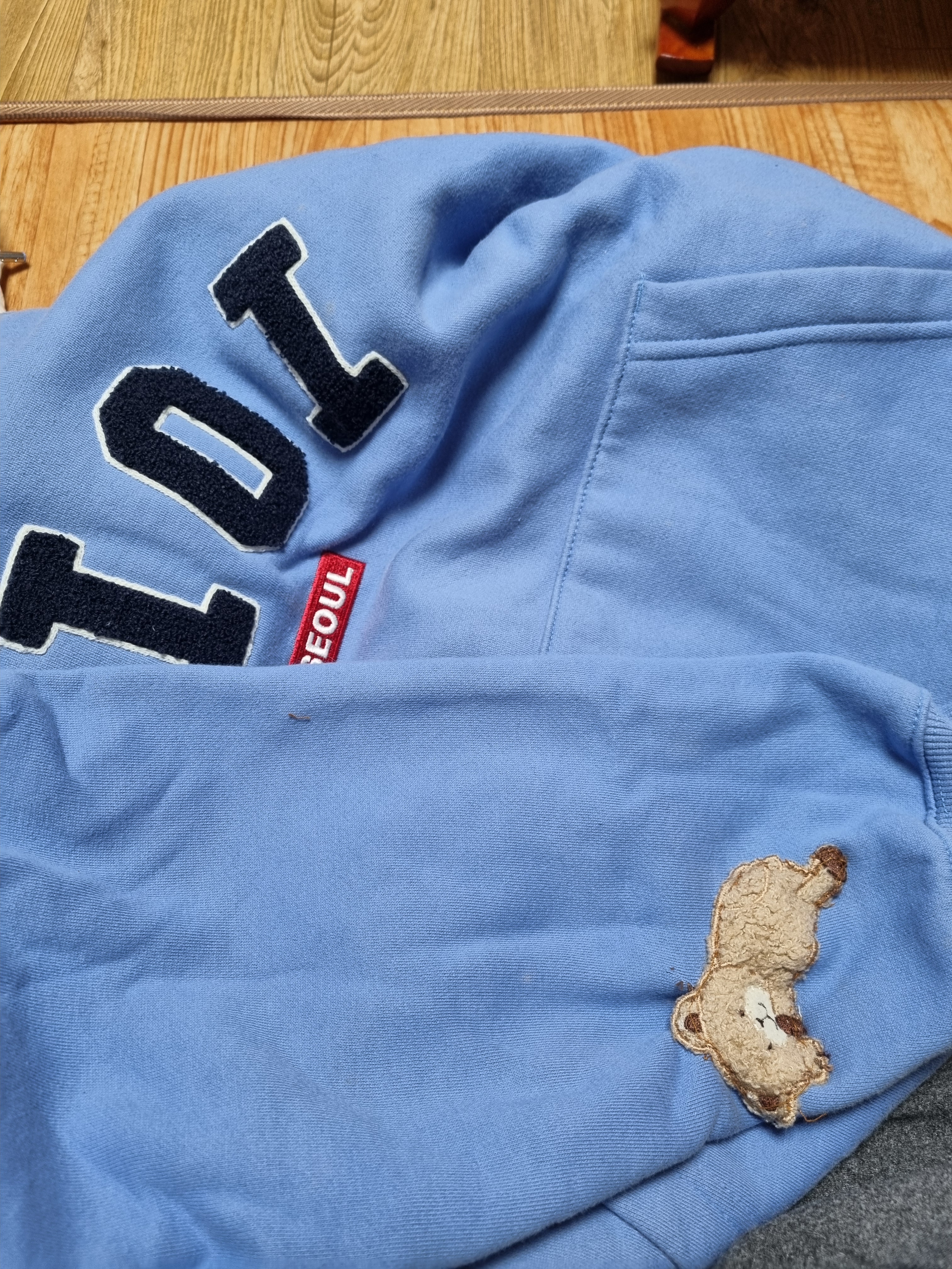 얼룩이 생겨 지워지지않는옷 버리기 아까워 작은와펜 구해서 손바느질 해서 얼룩 가리고 입어요
