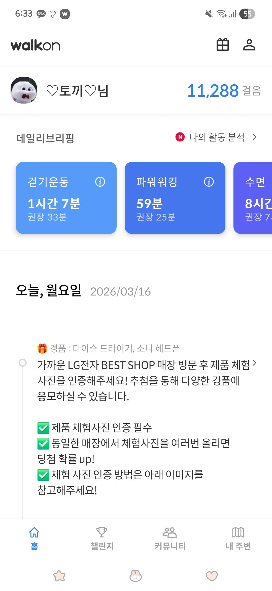 챌린지 적합도가 부족한 경우 비전시 (본인만 보임) 및 적립되지 않을 수 있습니다.