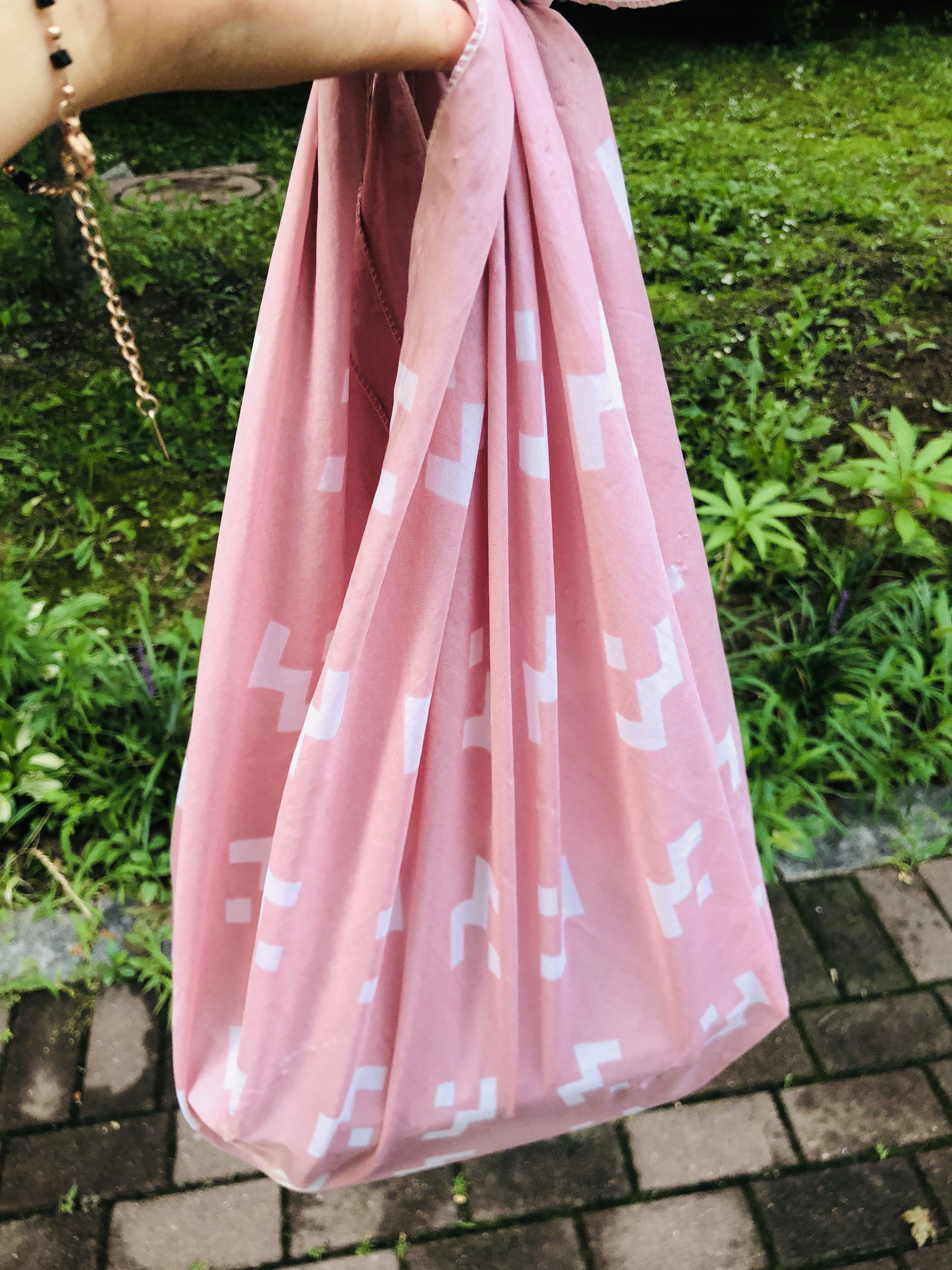 보자기 끝부분만 살짝 묶어주면 장바구니 역할을 충분히 한답니다 용기내서 음식 포장해올 때 사용했어요