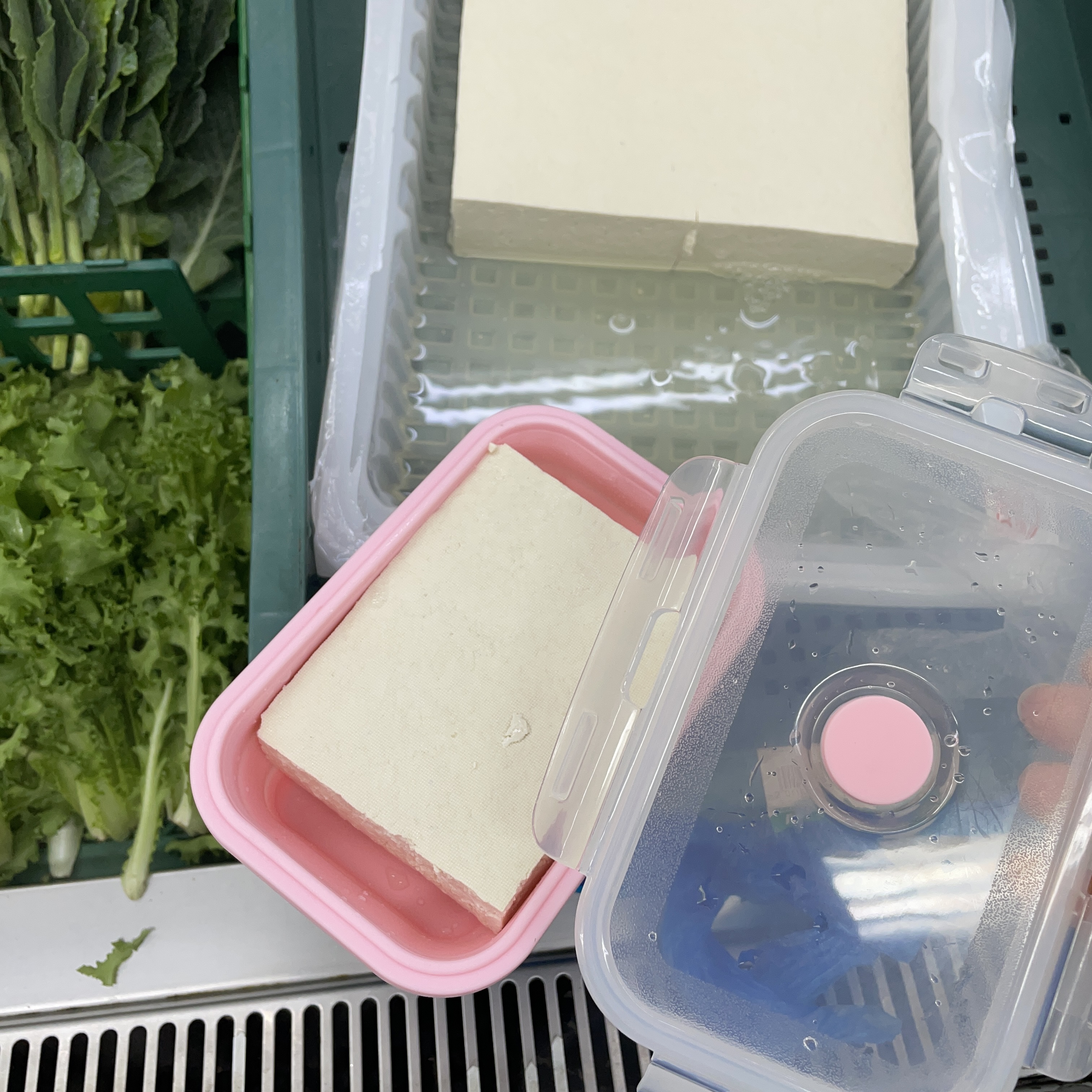 동네 마트에서 두부를 다회용기에 담아요어요
