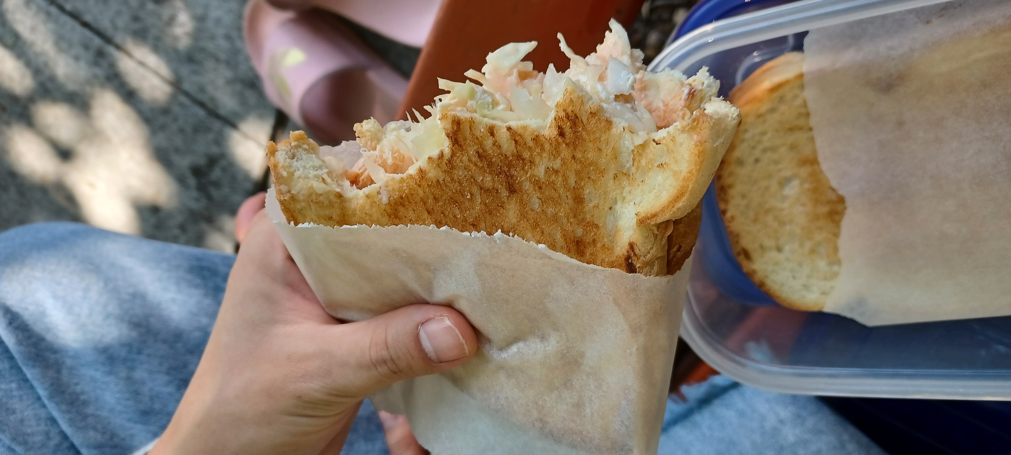 집에 안쓰는 반찬통 가져가서 샌드위치 담아왔어요 쿠킹호일로 싸주는것도 종이포일 잘라드리고 그걸로 싸달라 했고요 플라스틱 두어개 줄였다싶으니 뿌듯하네요~