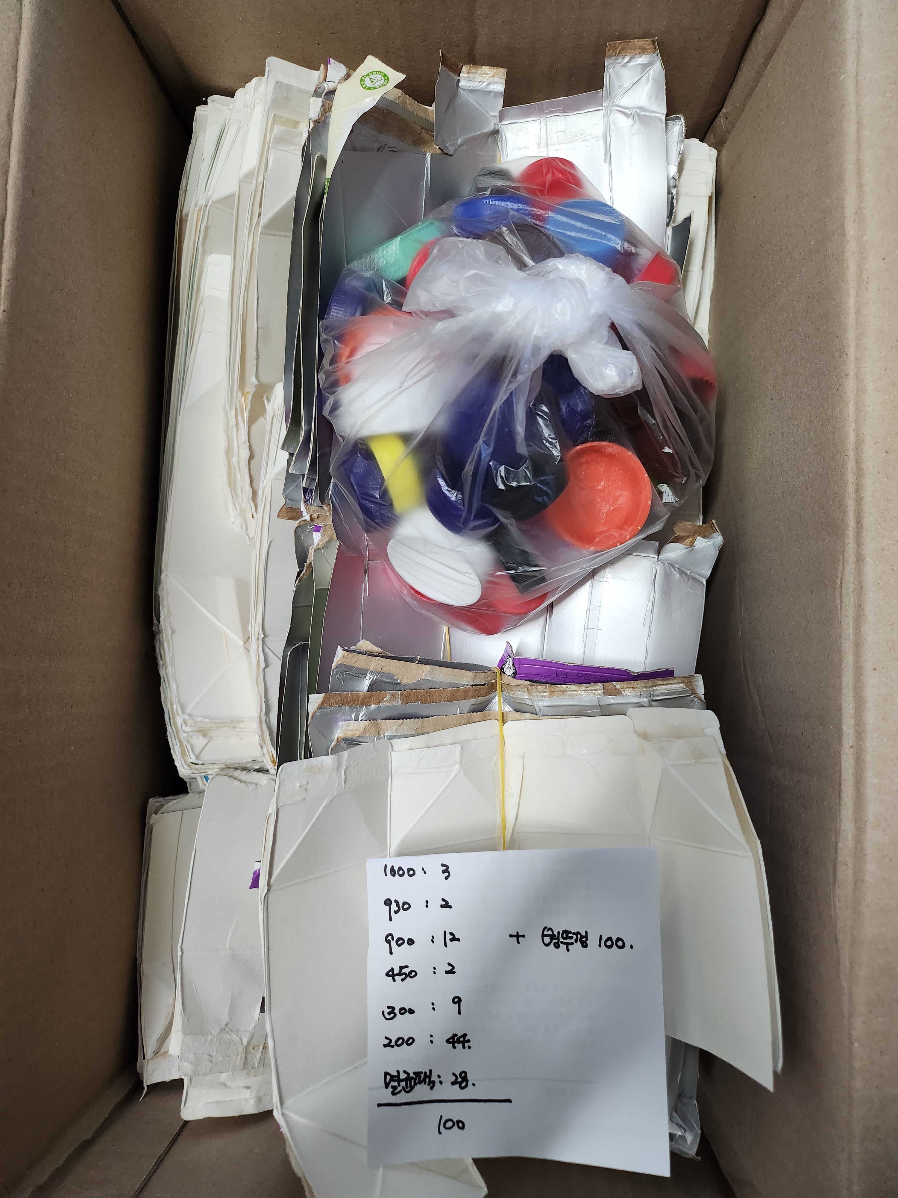 병뚜껑 100개, 우유팩 100개 택배로 보냈습니다