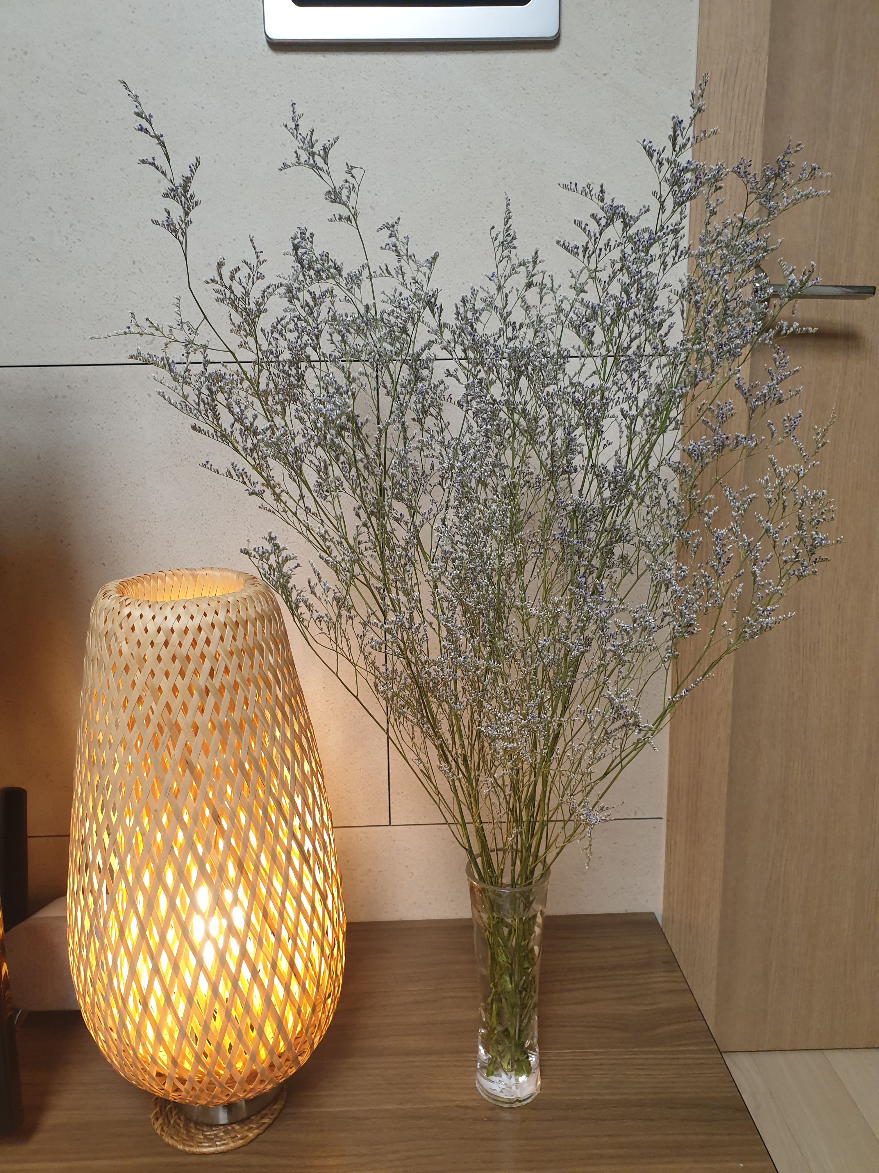 우연히 가게를 지나다가 가져가도 된다는 미스티블루ㄴ 꽃을 주워와 라탄등 옆에 놓으니 가을가을하다