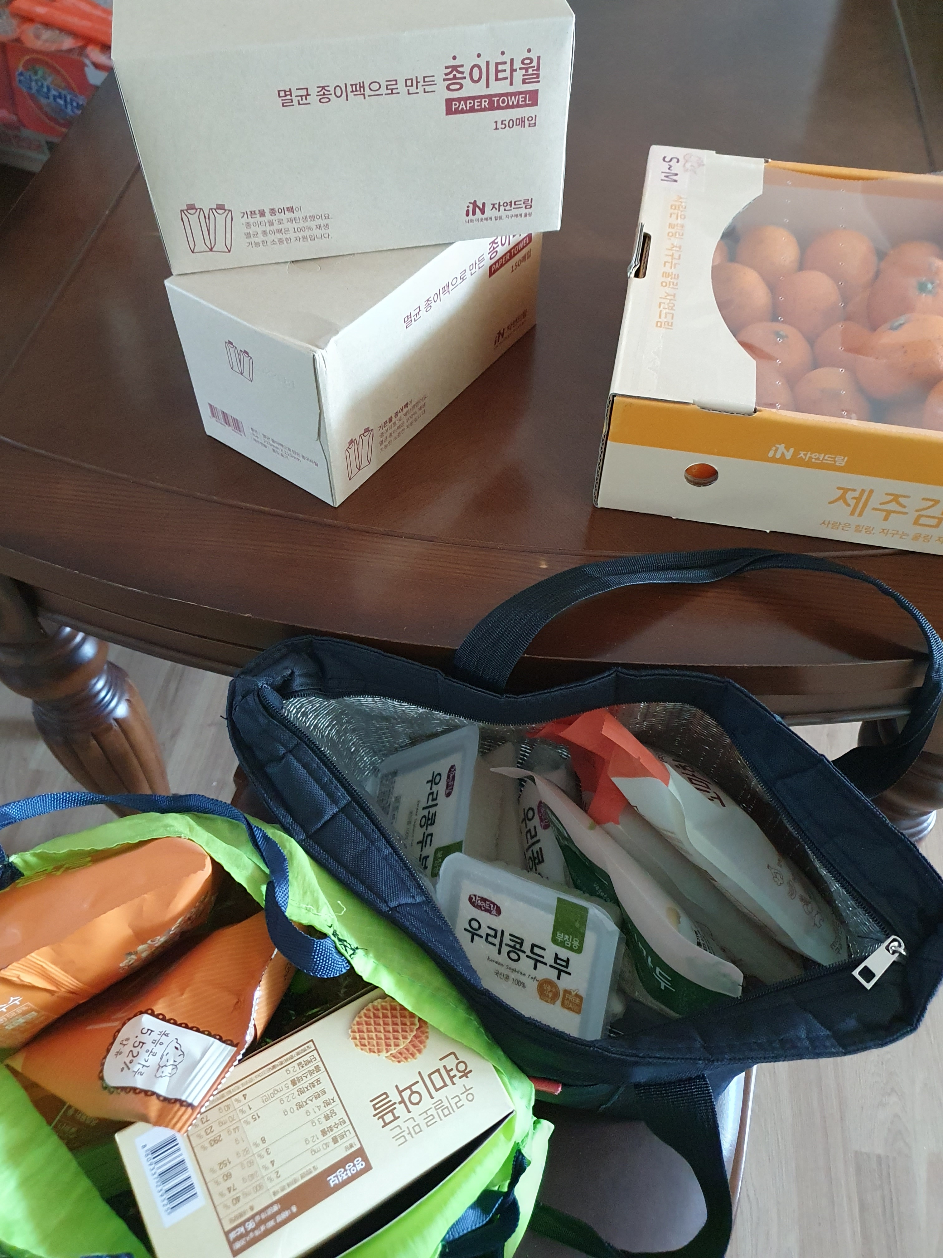 장바구니겸 보냉백으로 쓰는 가방 챙겨가서 10년 넘게 애용중인 유기농 매장에서 우리콩 두부, 우리밀 핫도그와 우리밀 현미와플, 우리 옥수수 팝콘 등 국산 농산물 장봐왔어요.