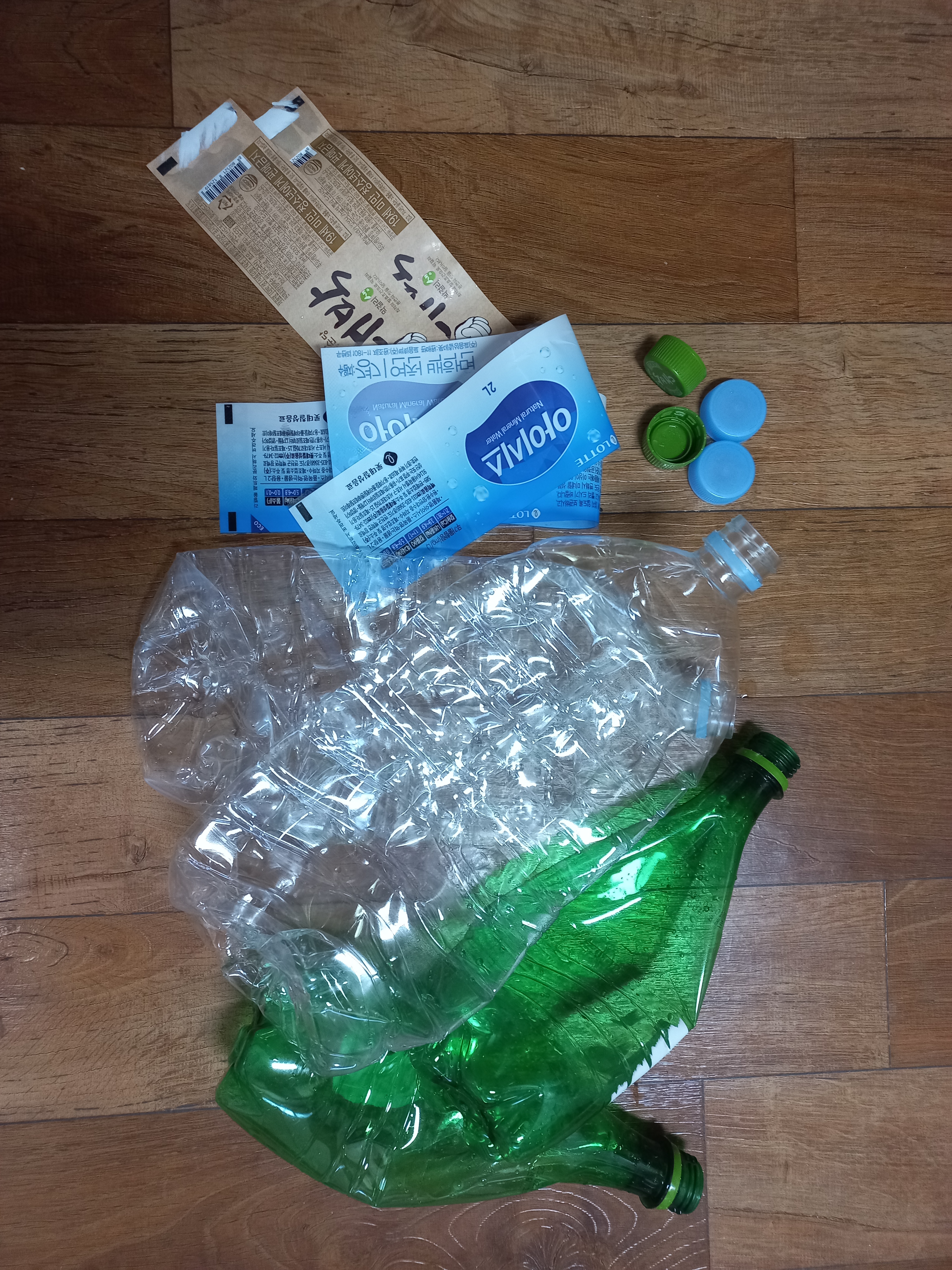 생수, 막걸리용기는 내용물 깨끗하게 씻고 라벨지 제거하고 뚜껑도 따로 보관 후 모아서 보낼것입니다. 가족이 많은 집은 이렇게 여러 종류의 펫트병이 있어 철저하게 분리합니다.