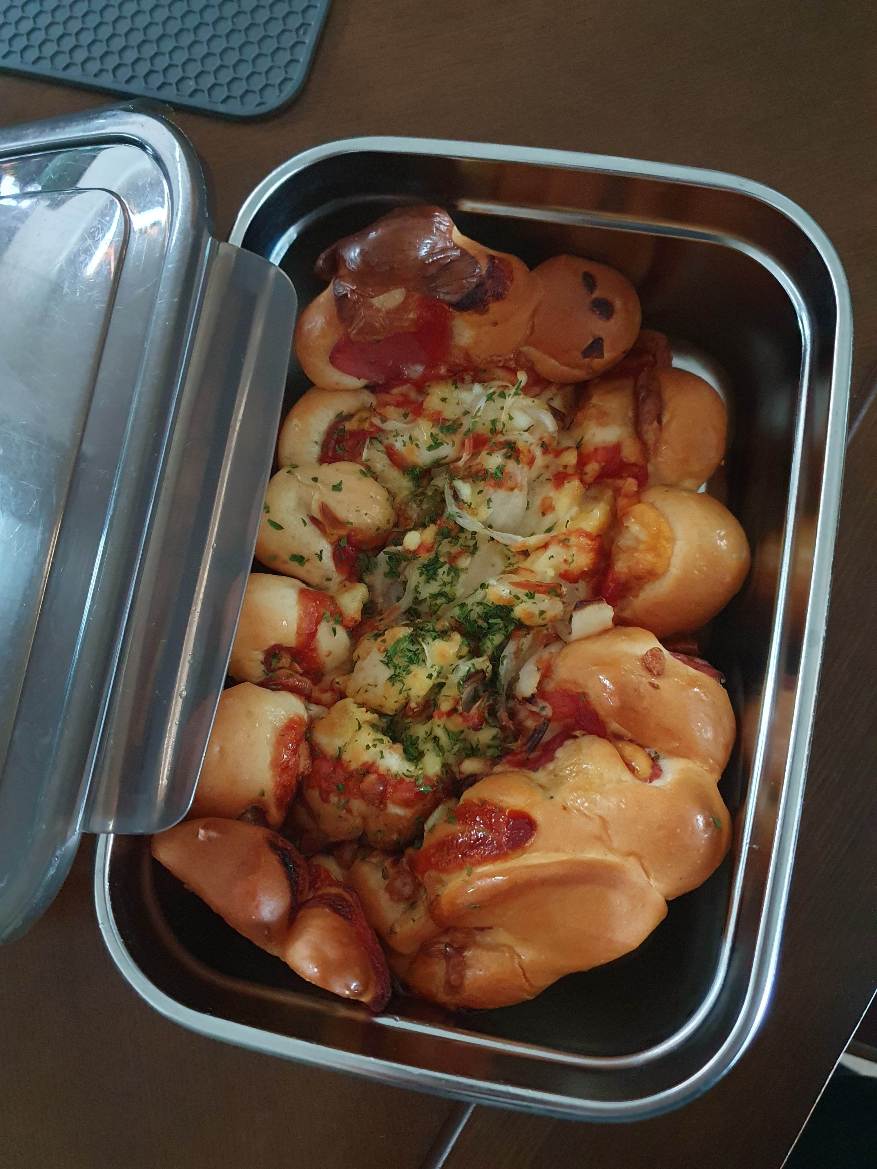 이시간에 바로 구워 주는 피자빵 뜨거워서 용기 갖고 가서 담아왔어요^^