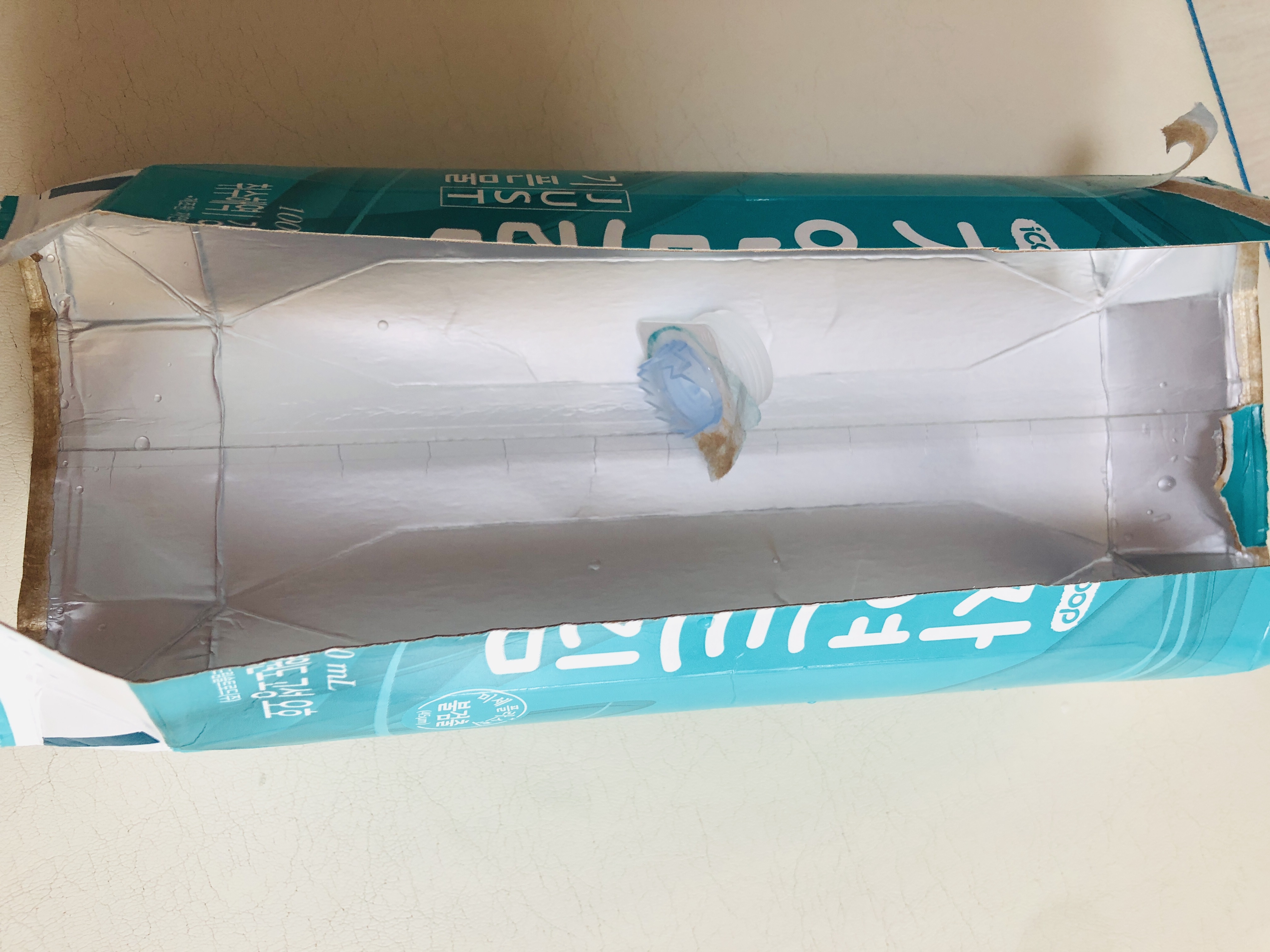 멸균팩에 있는 미네랄 물 마시고 캡 분리했어요 의욕이 앞섰는지 손 베였네요ㅜㅜ 캡이 왜이렇게 날카로운지.. 그래도 뿌듯하네요