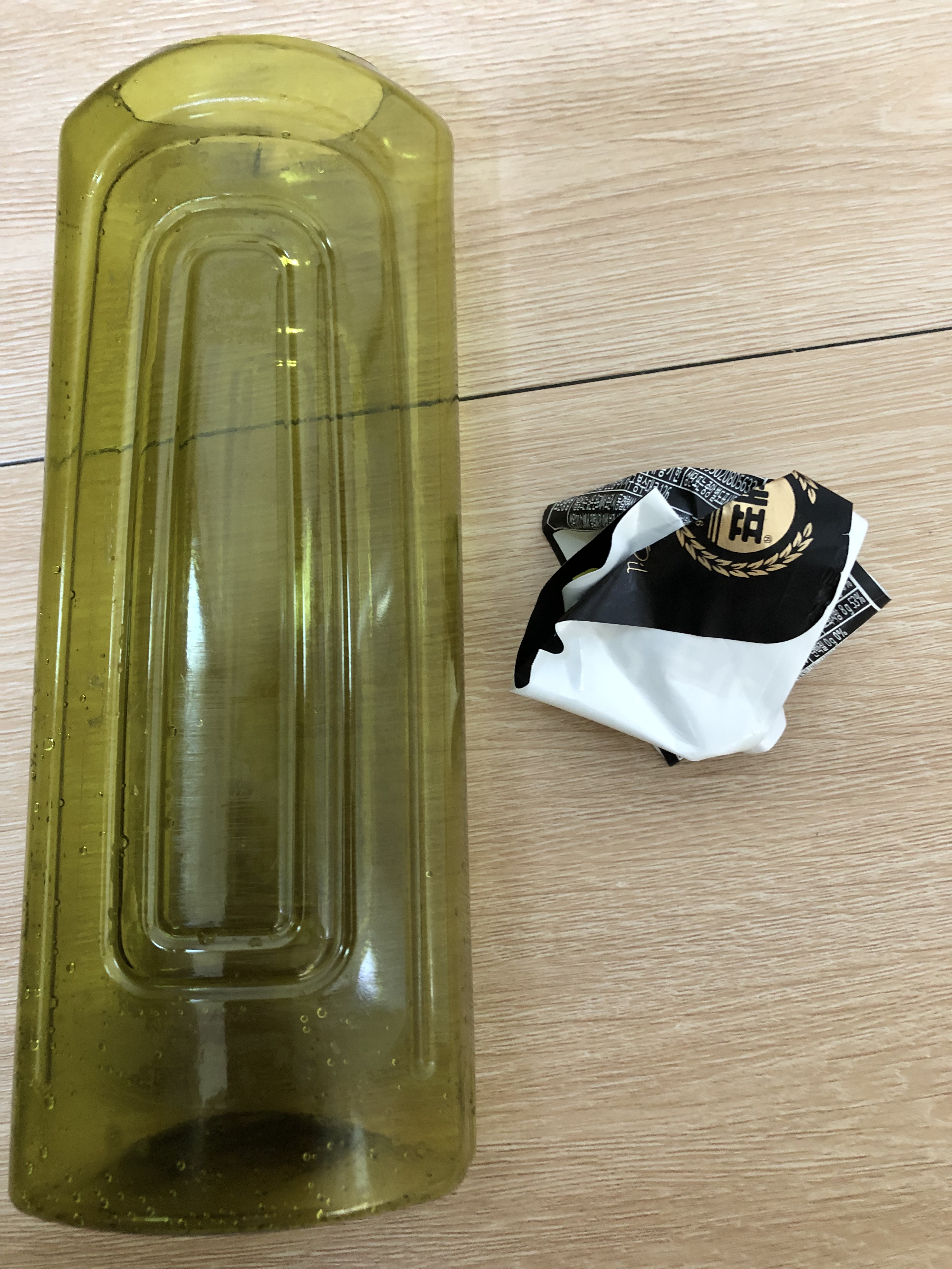 카놀라유에 부착된 라벨을 제거했음. 기름통은 뚜껑을 몸체에서 분리하기가 몹시 어렵다.