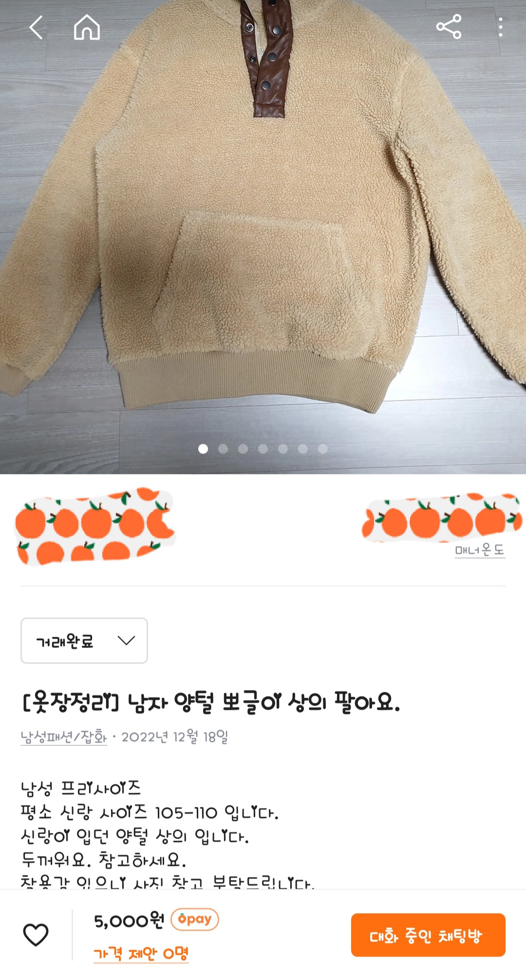 남자 양털 뽀글이 상의 중고거래 판매완료