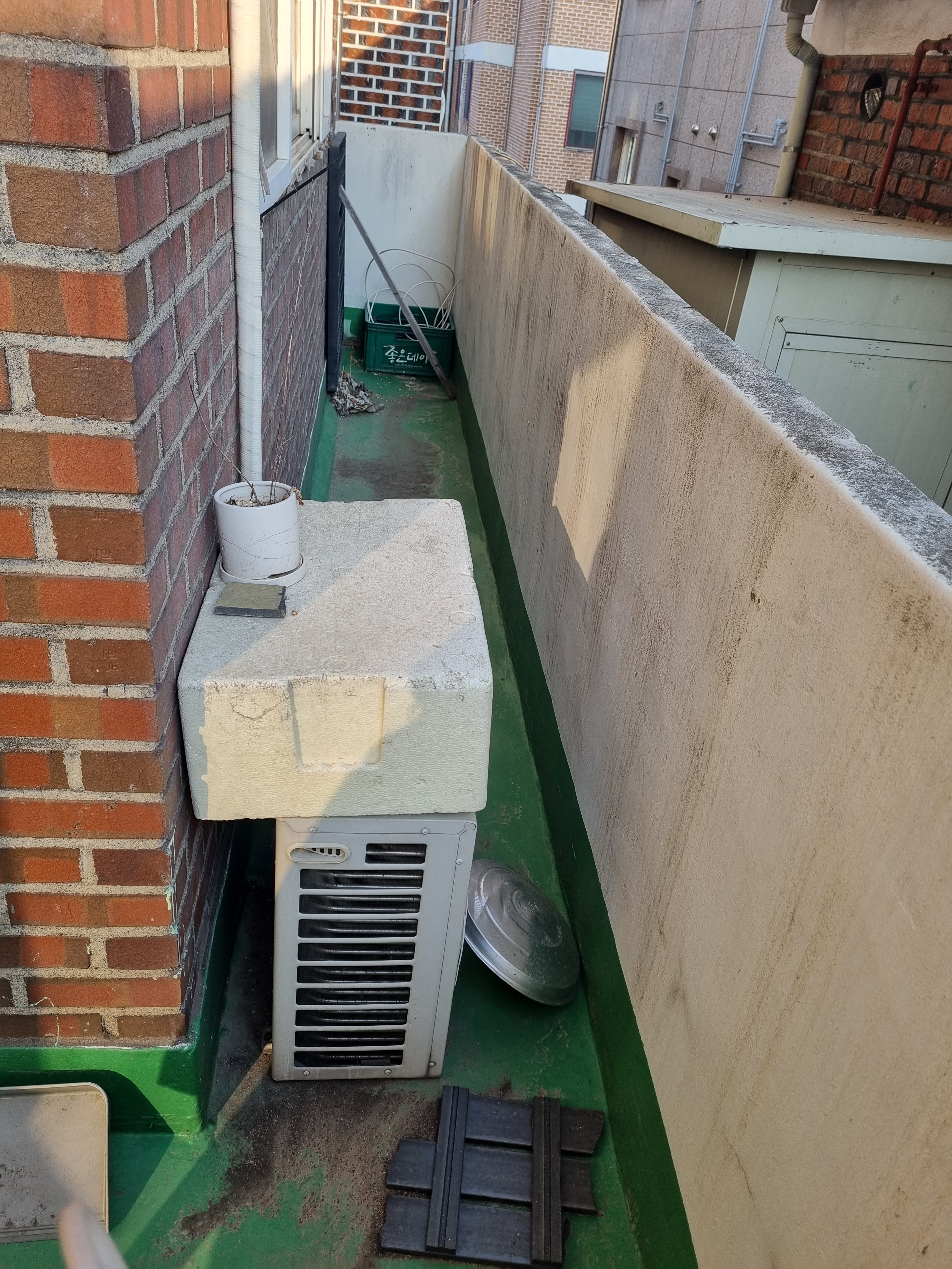 에어컨 실외기에 햇빛 차단해주면 효율이 올라간대요. 따로 뭘 설치할 여력은 없어서 스티로폼 상자를 올려뒀어요.