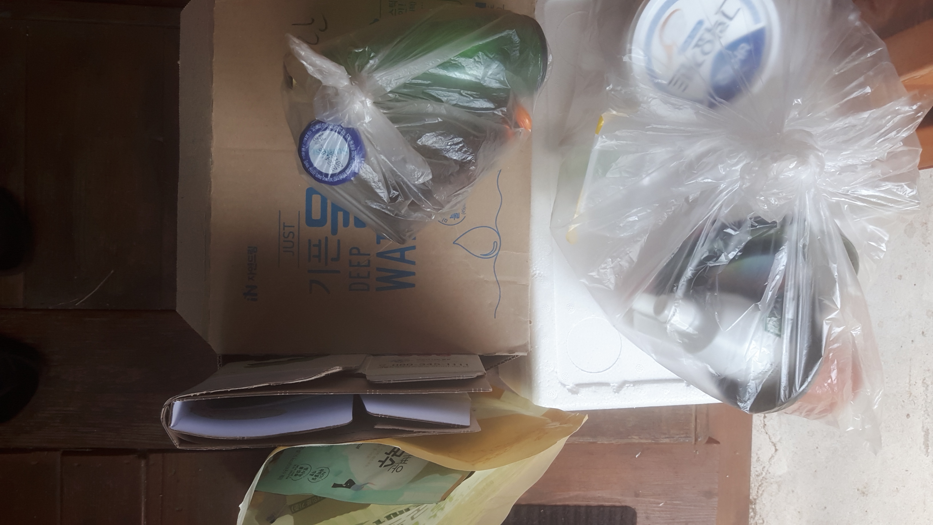 수거함은 없지만 비닐봉지에 넣어 배출해야하는 동네인지라 분리하여 비닐에 넣어 배출합니다