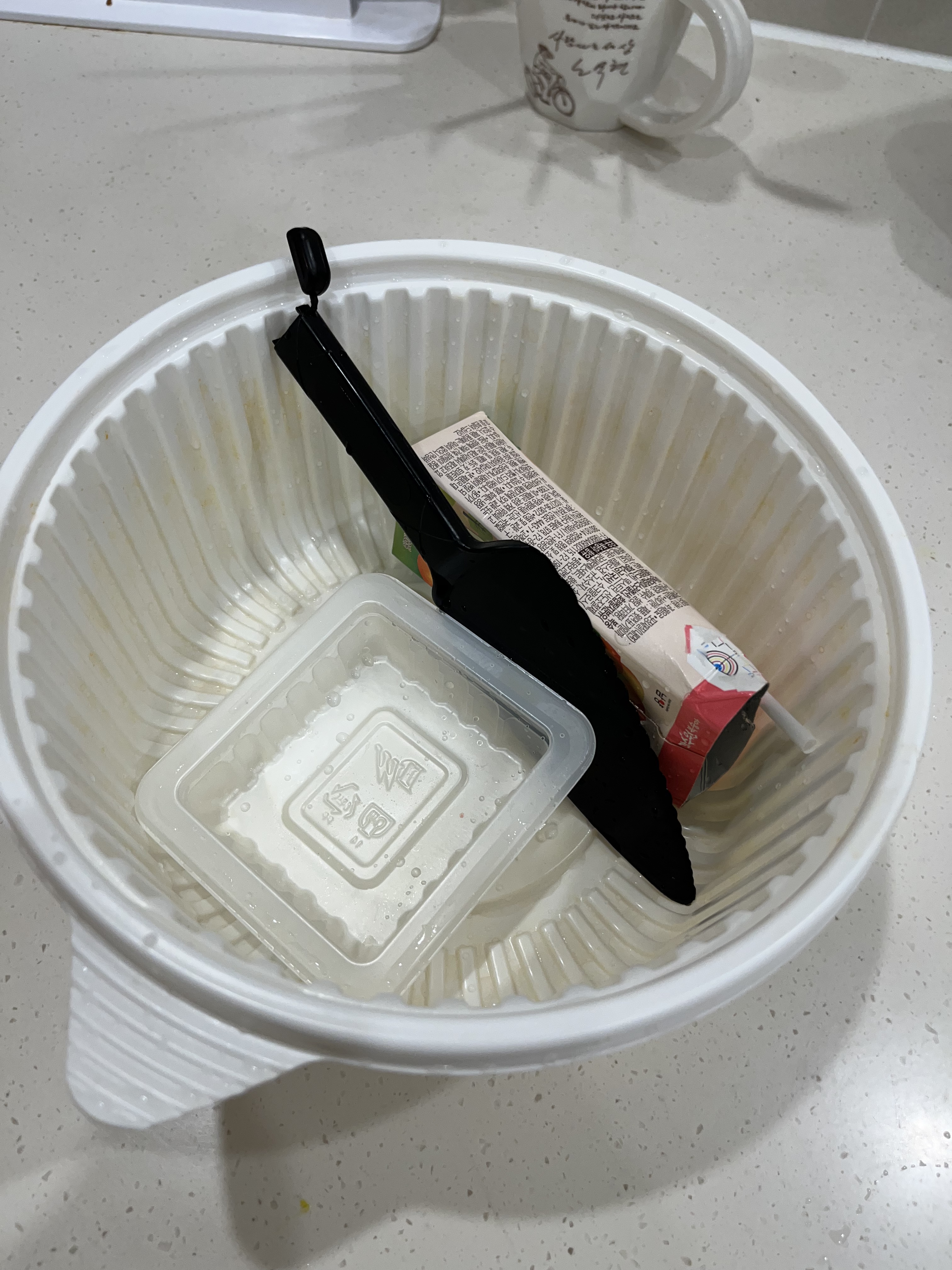 배달 떡볶이 용기와 음료수 팩, 케잌 칼 등 분리수거용품 세척했어요.