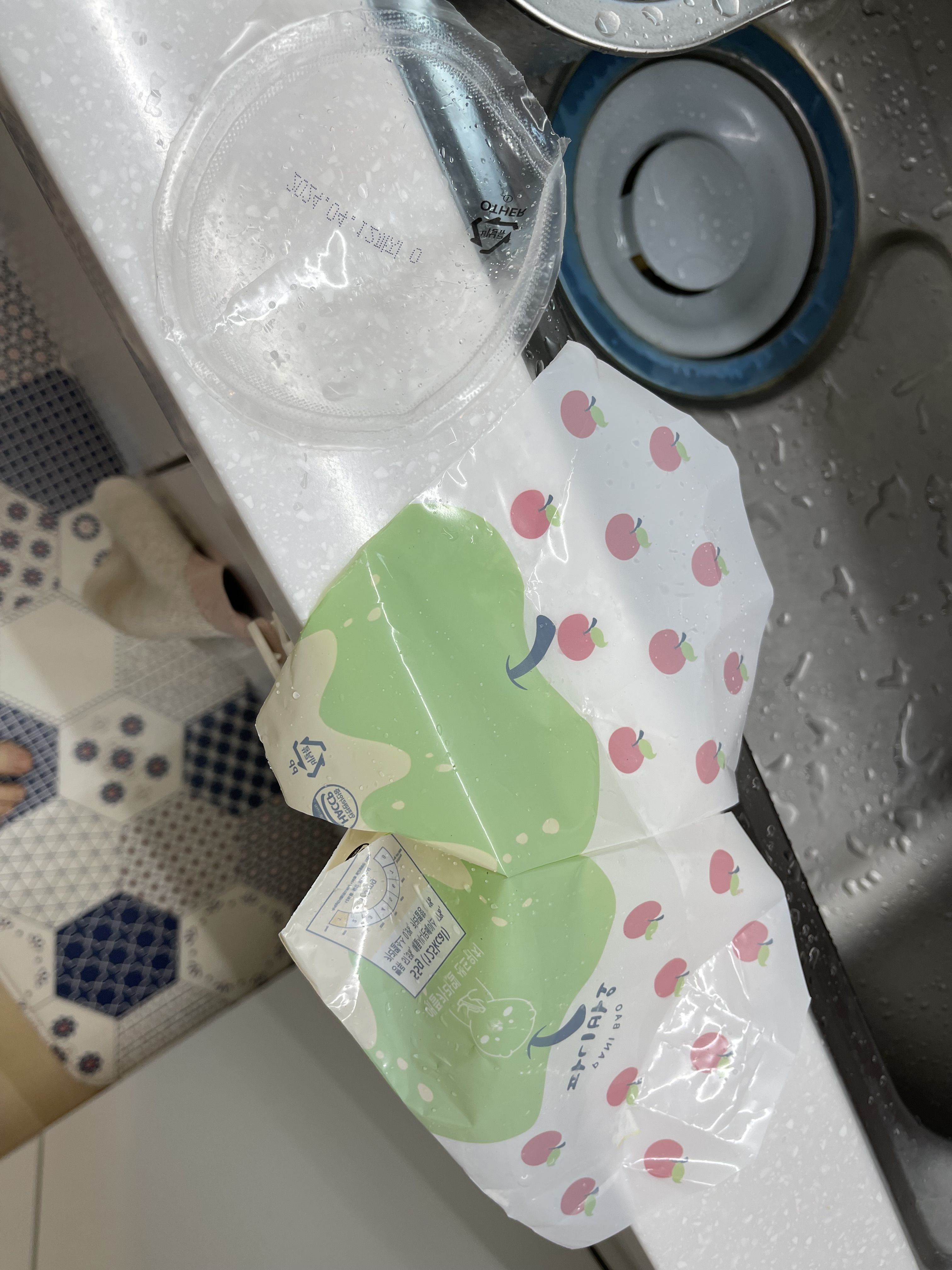 샌드위치 포장과 감자샐러드 뚜껑 비닐에 묻은 음식물을 깨끗이 씻어 말려서 분리배출합니다.^^
