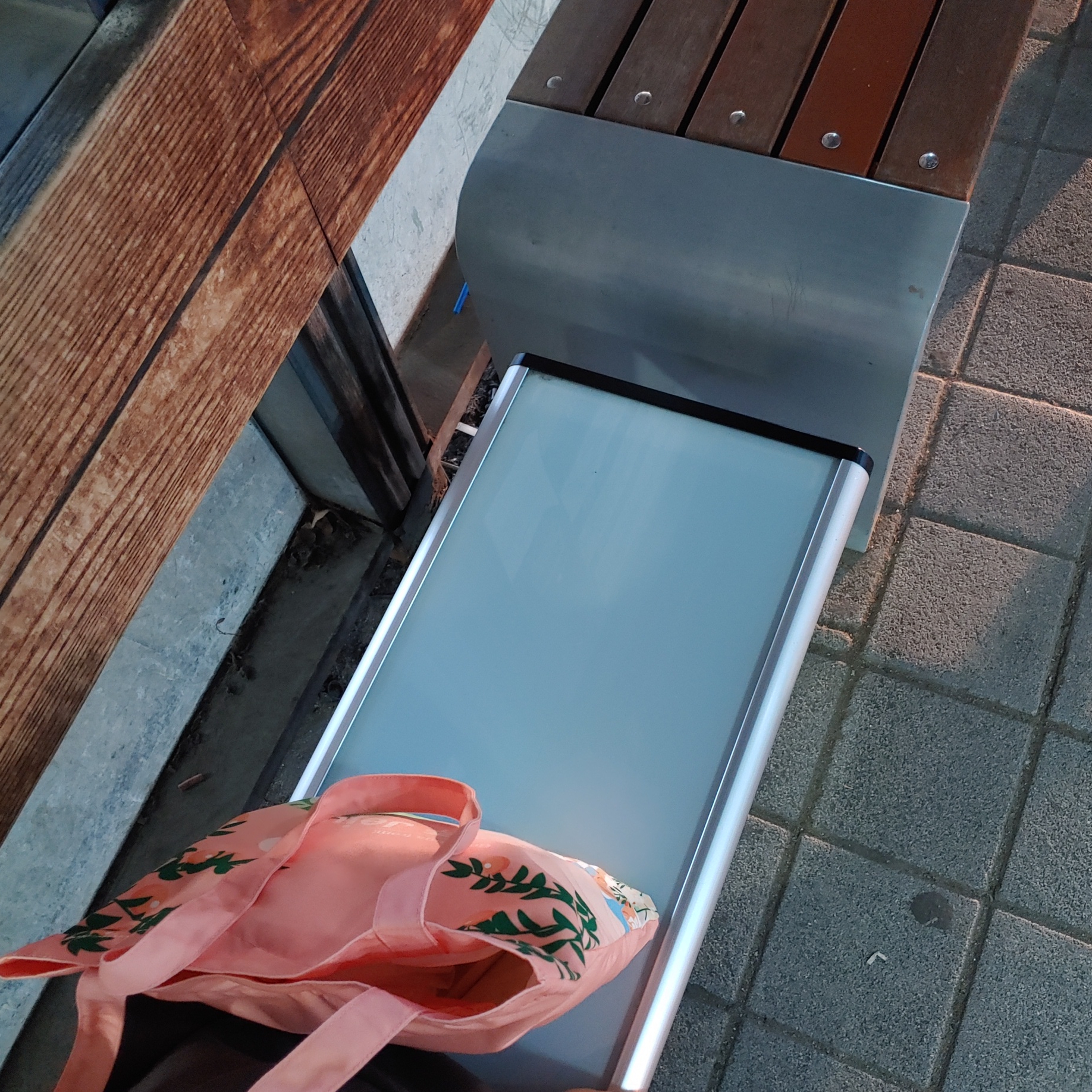 에코백과 함께 버스정류장에서 버스기다리기