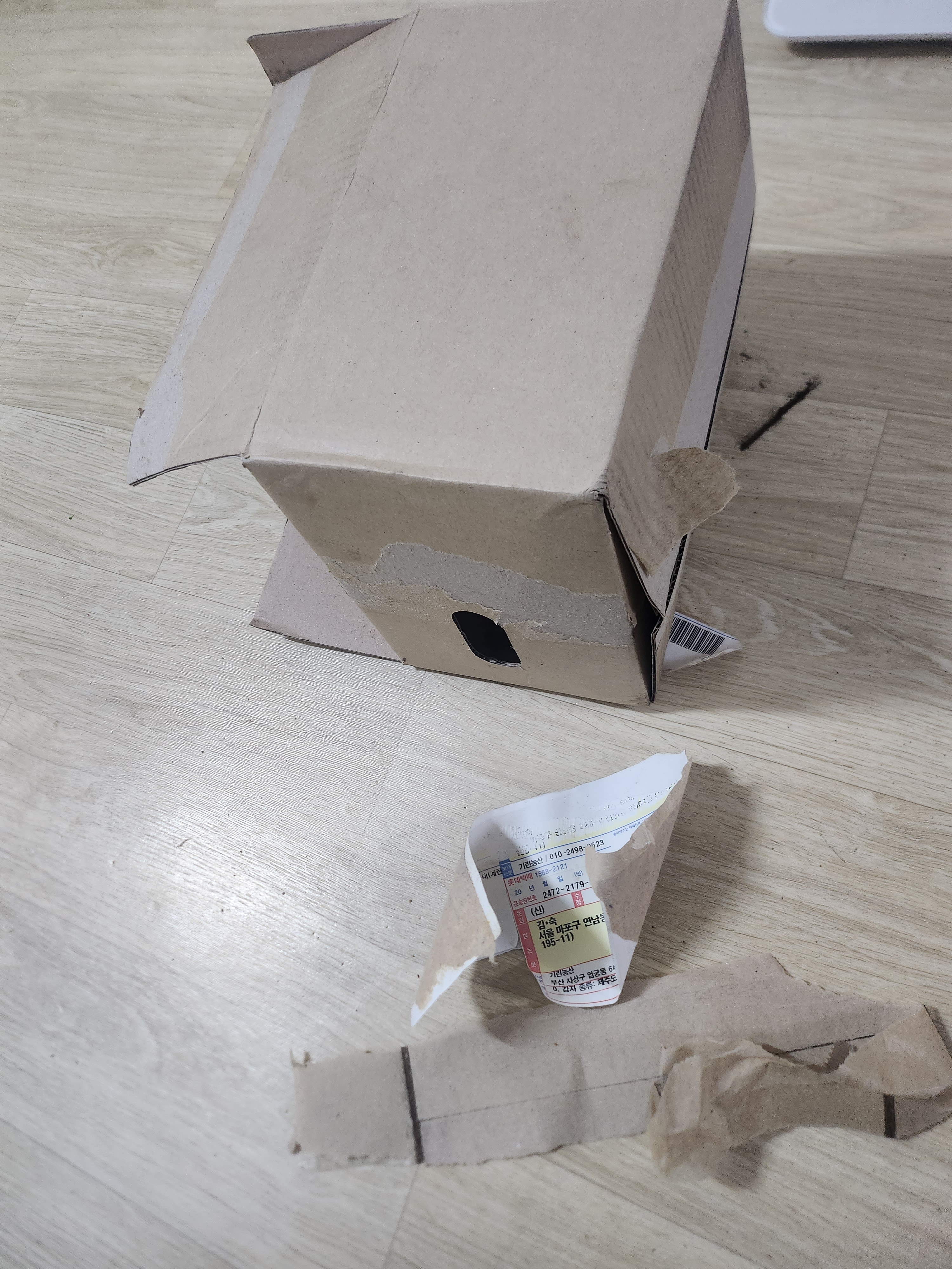 택배박스 배송장제거. 테이프 제거후 배출 실천