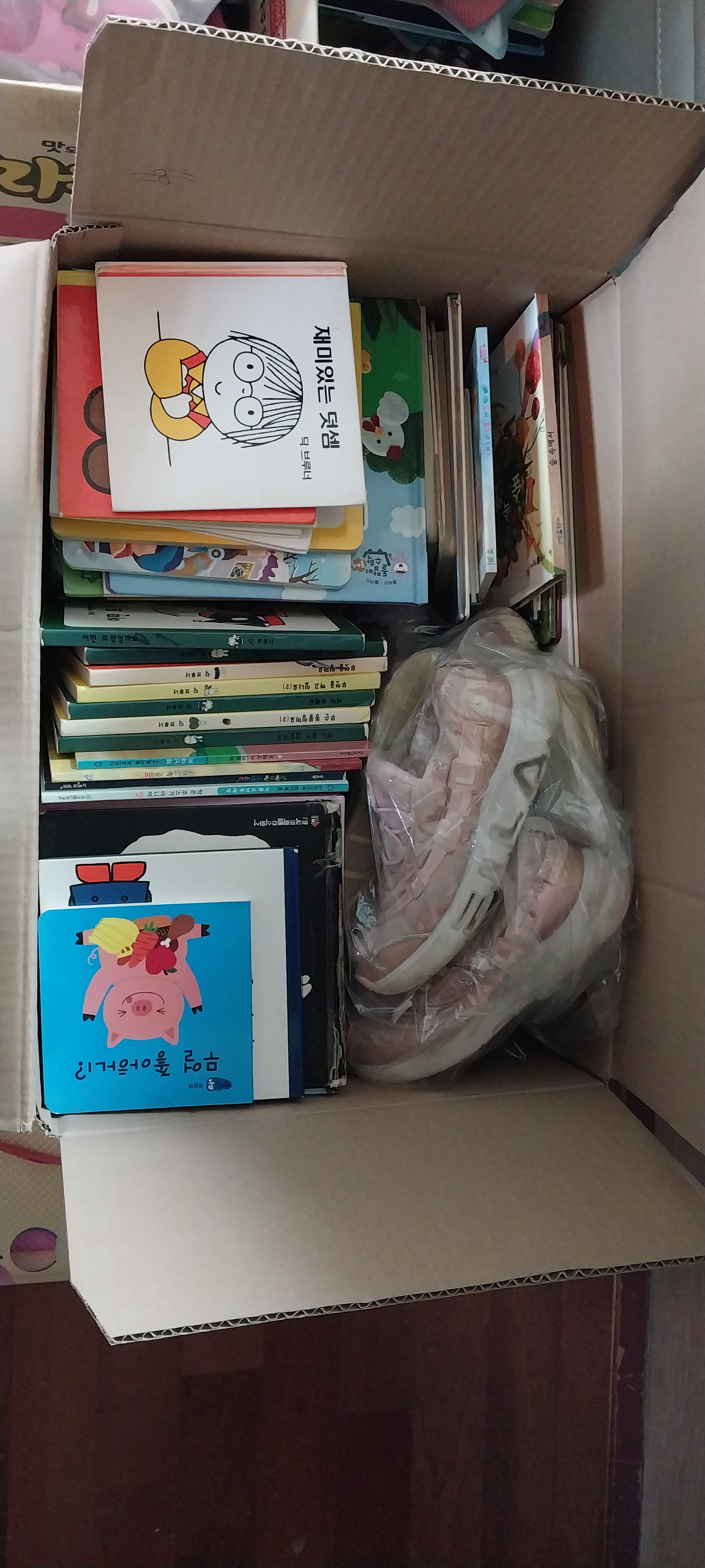 와이프와 아이들이 한박스에 다 못넣은걸 다시 새박스에 담기 시작했어요 가족이 다함께 정리하니 아이들에게 교육도 되고 좋네요