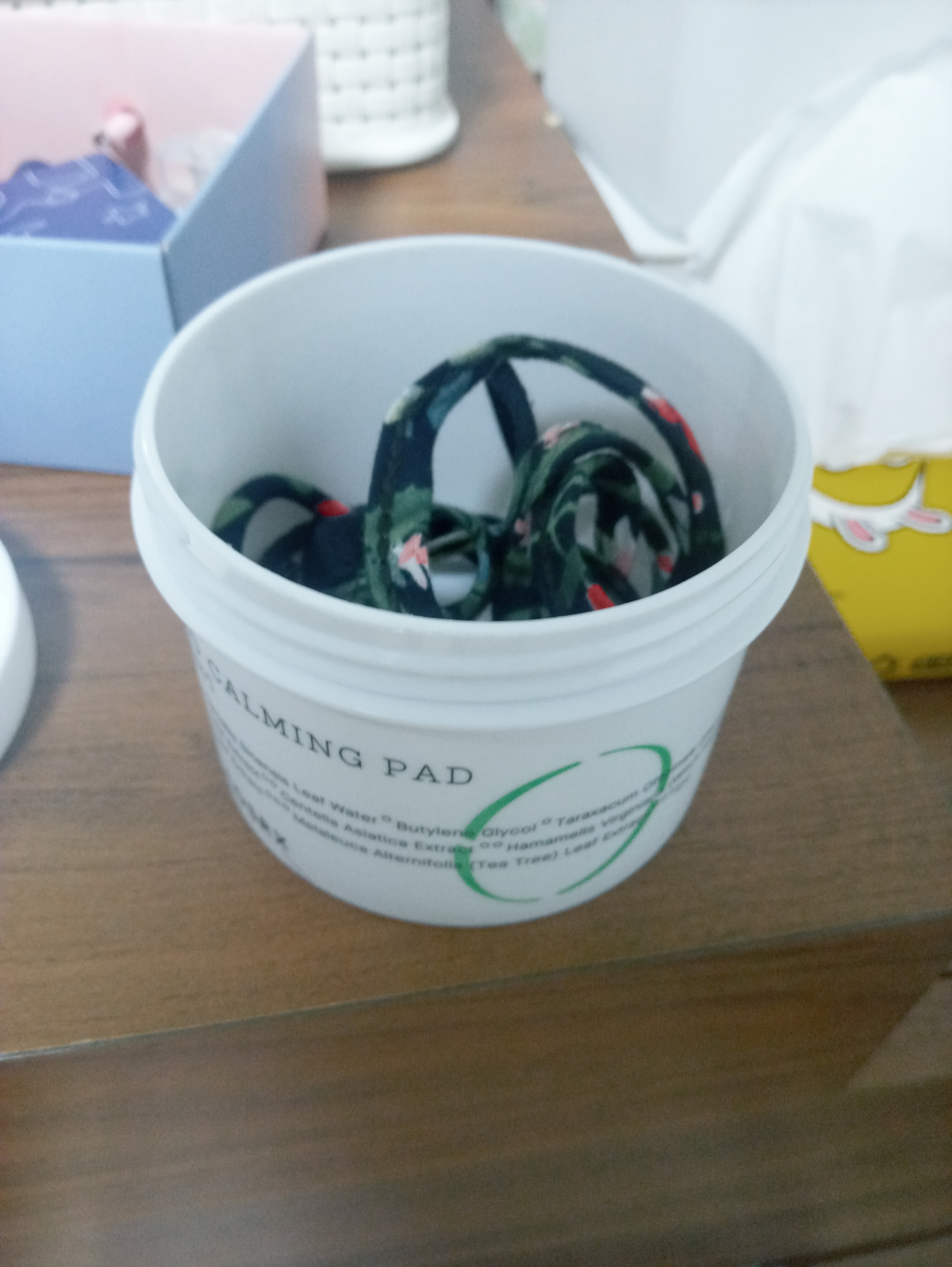 다쓴화장품통 여러 끈들 머리끈들을 모음