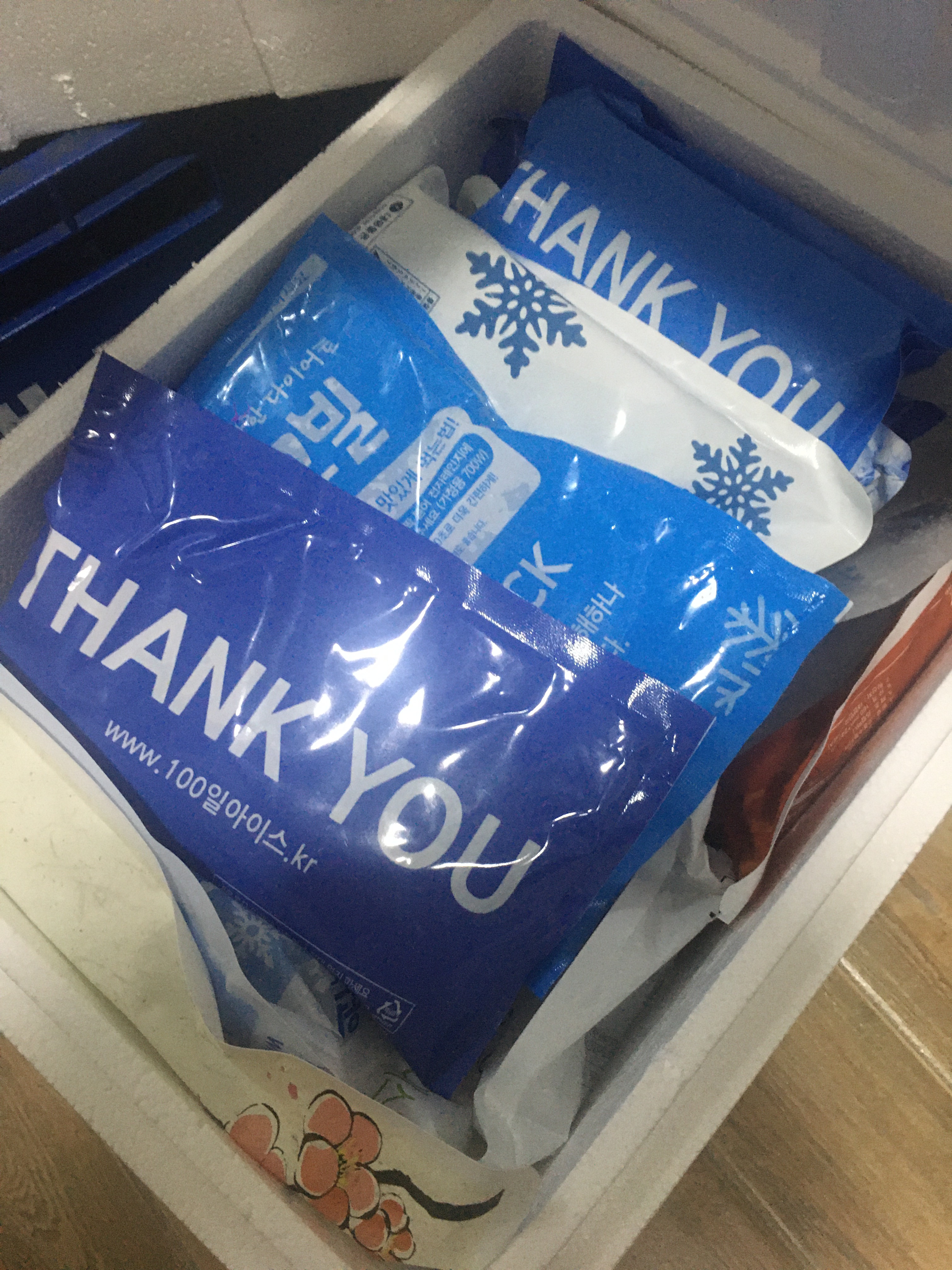 아이스팩들을 박스와 스티로폼에