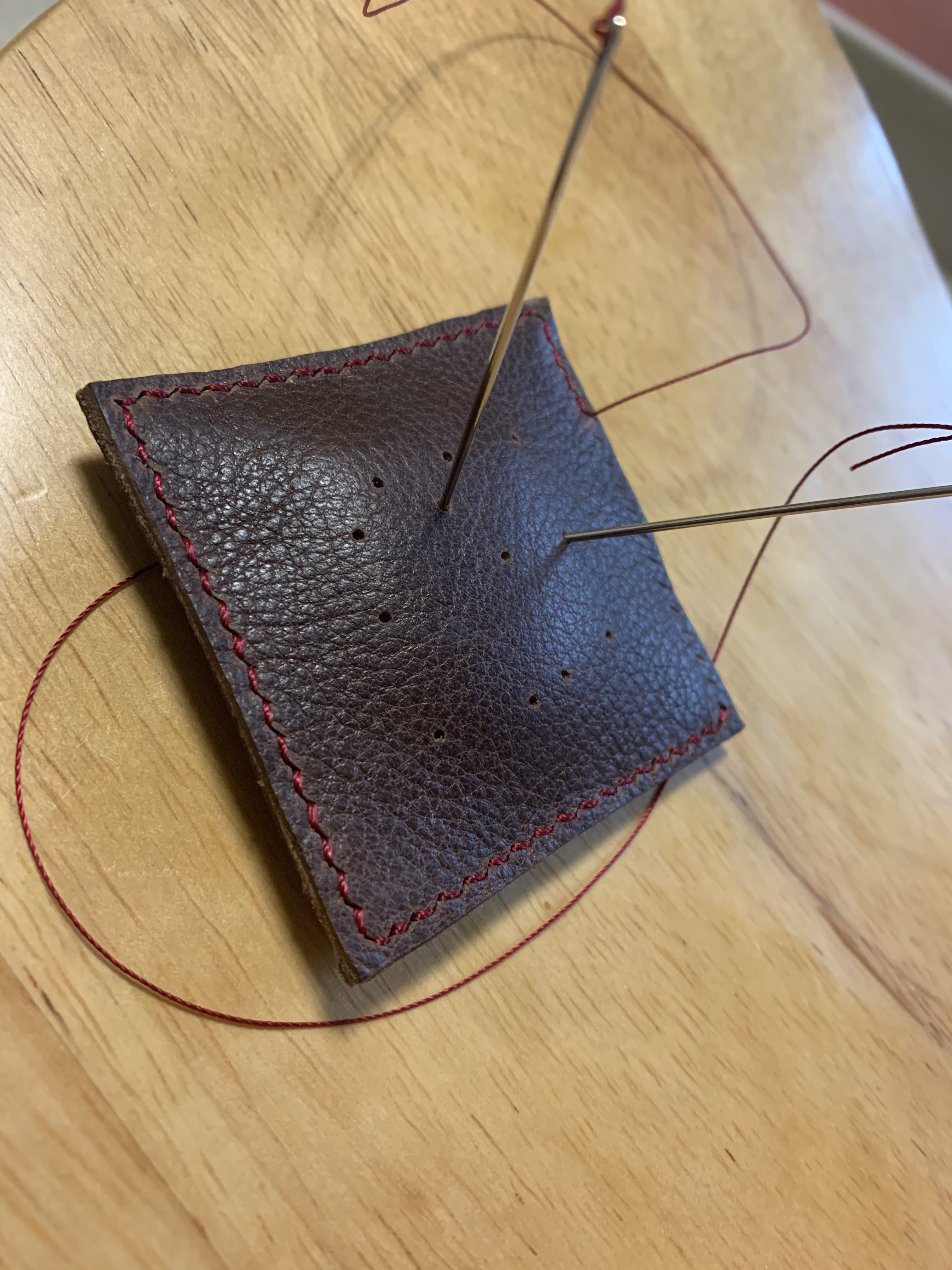 가운데에 원하는 갯수만큼 구멍뚫어주고 옆부분만 바느질해주니 근사한 바늘꽂이가 되었네요~