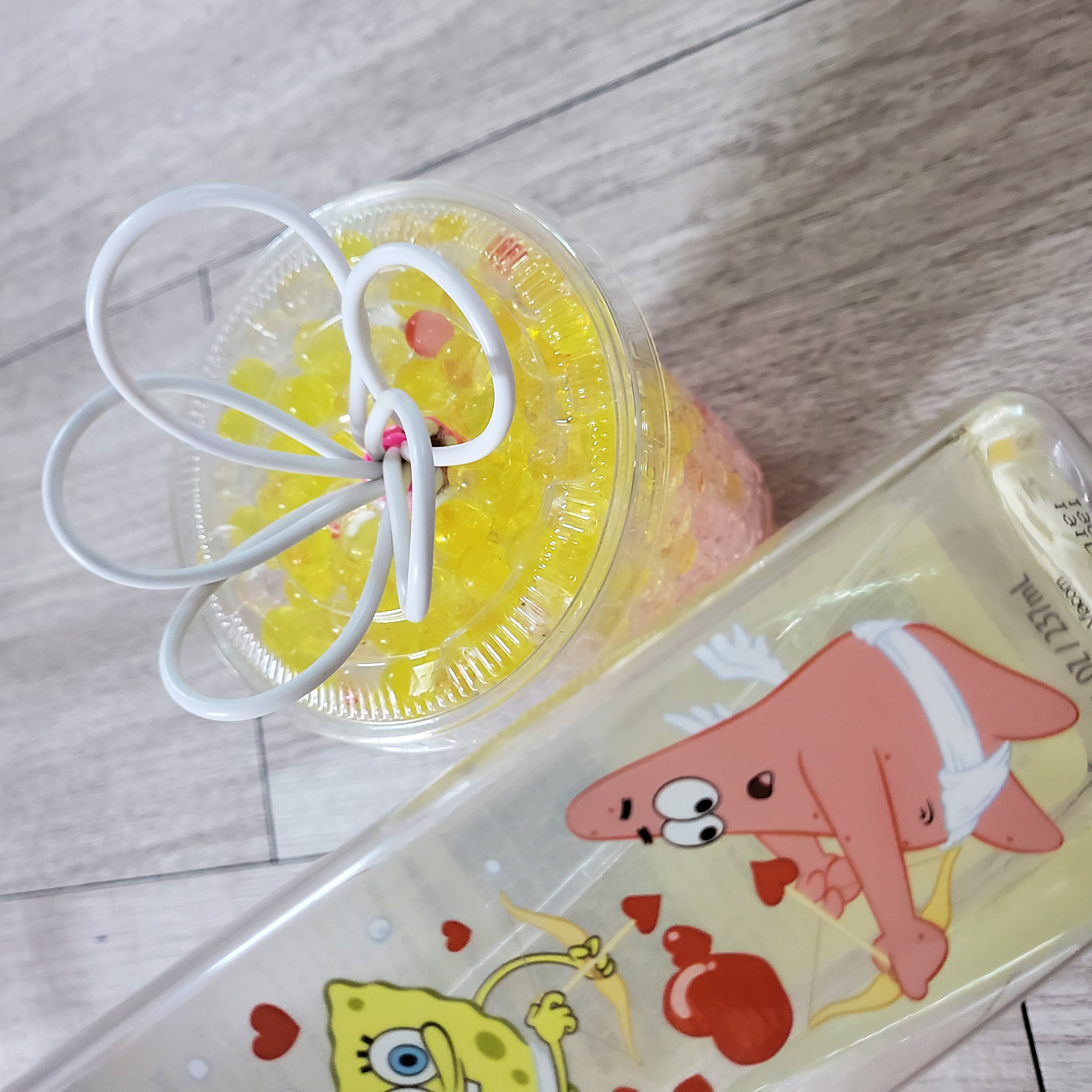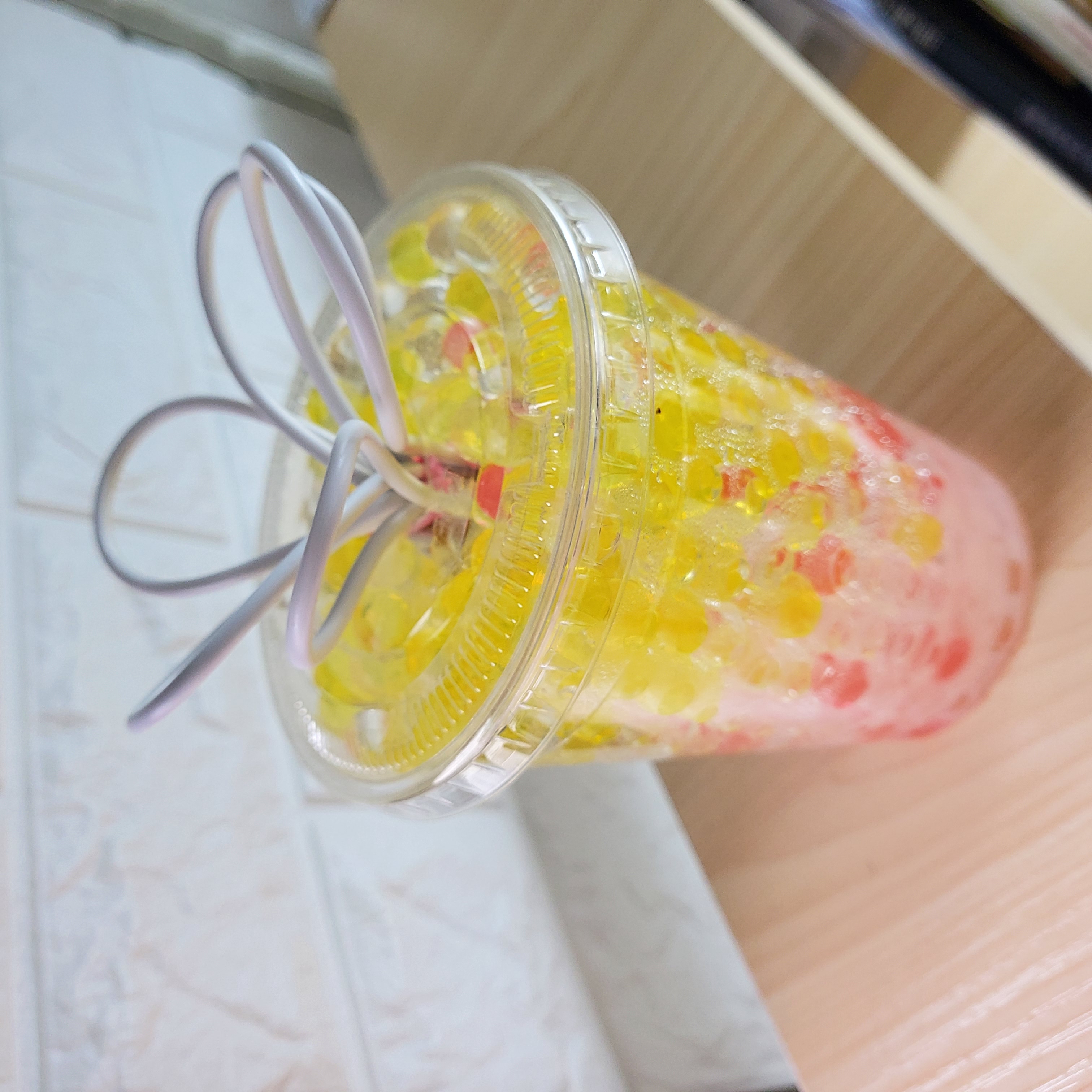일단 펀의점에서 먹은 커피 컵 씻어 뚜껑까지 보관했다가 일명 개구리알 물과 넣어 불려주면 이렇게 불어나면서 예뻐져요