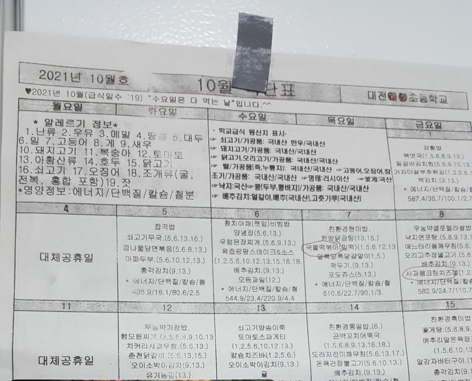 냉장고에 전단지 자석으로 식단표 붙여둬요