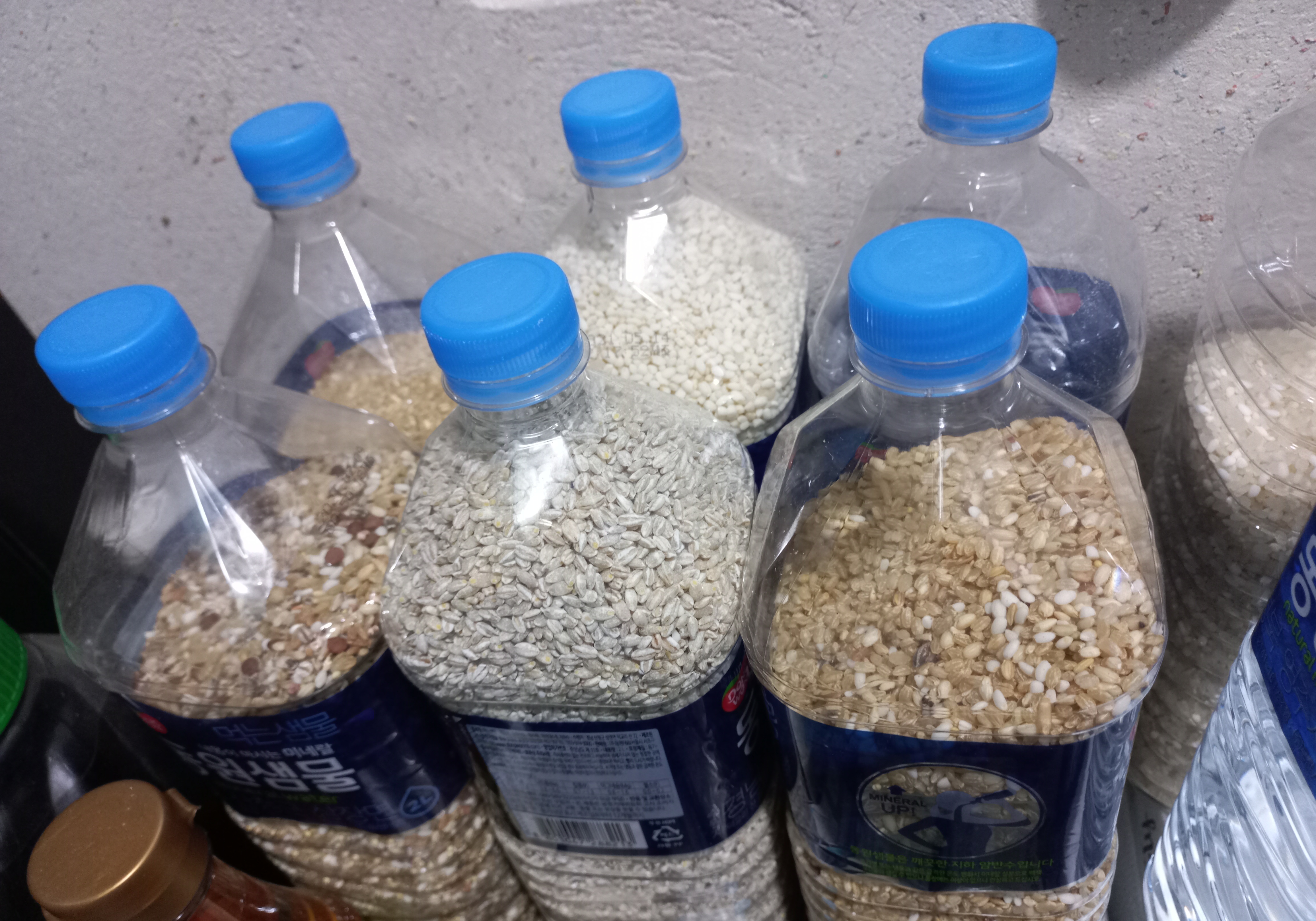 저희 집은 생수를 먹고있어서 패트병이 많이 나오는데요, 재활용하고 남은 병은 잘말려두었다가 잡곡이나 쌀을 담아두고 있어요, 자리도 많이 차지하지않고 가벼워서 보관하기에도 편해요