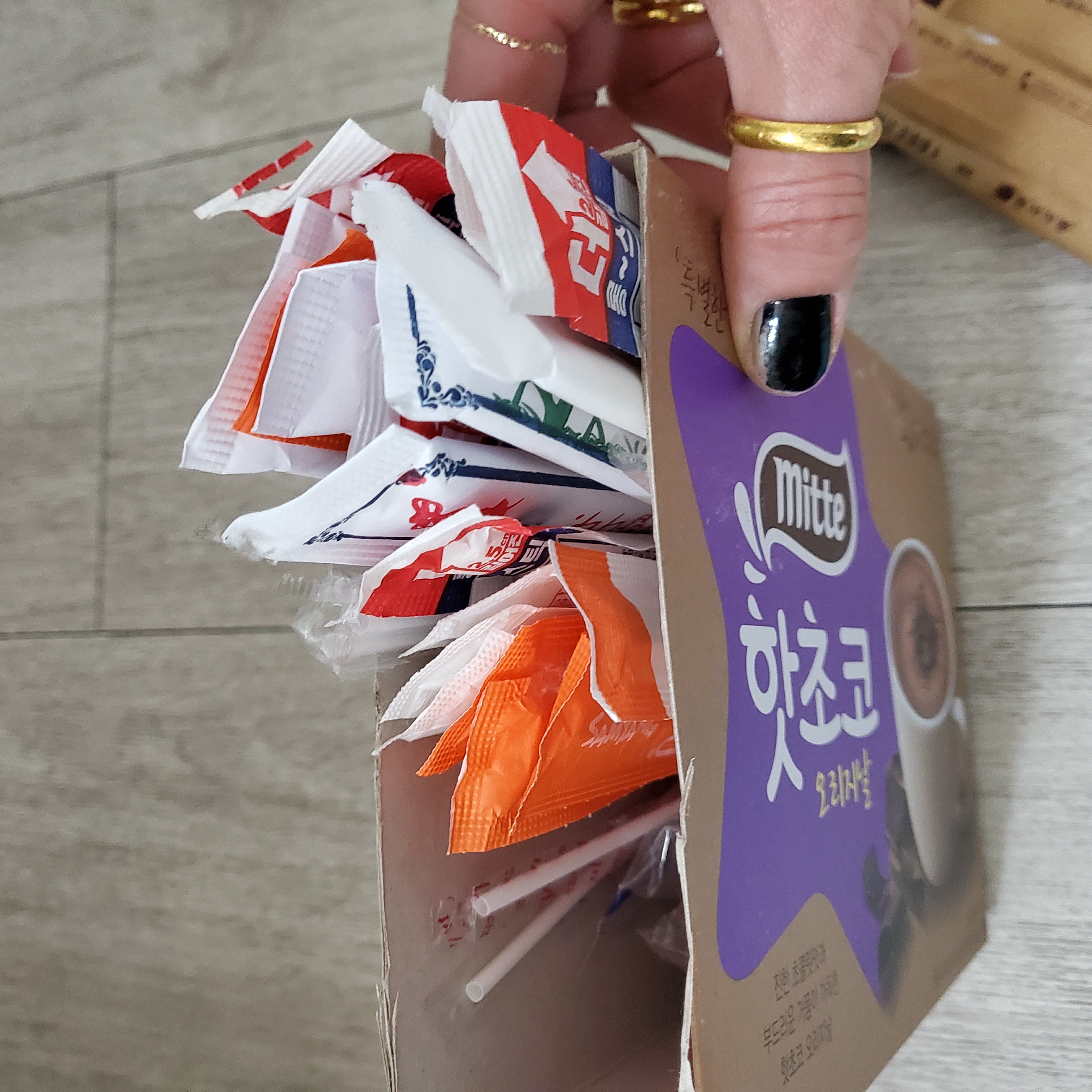 핫초코 정리정돈 하면서 남은 상자 테두리 깨끗하게 잘라서 마트에서 가져온 나무젓가락 일상 생활에서 생긴 젓가락 사발면 젓가락등등 모아 정리정돈 해 놓으니 좋던데요~^^