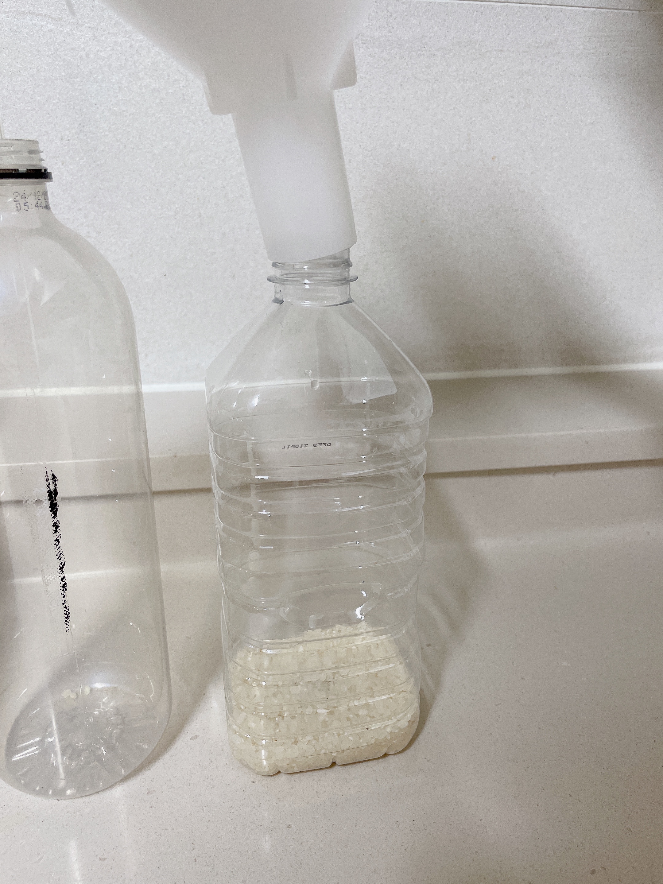 말린 페트병에 깔대기를 이용해서 쌀을 넣어줍니다.