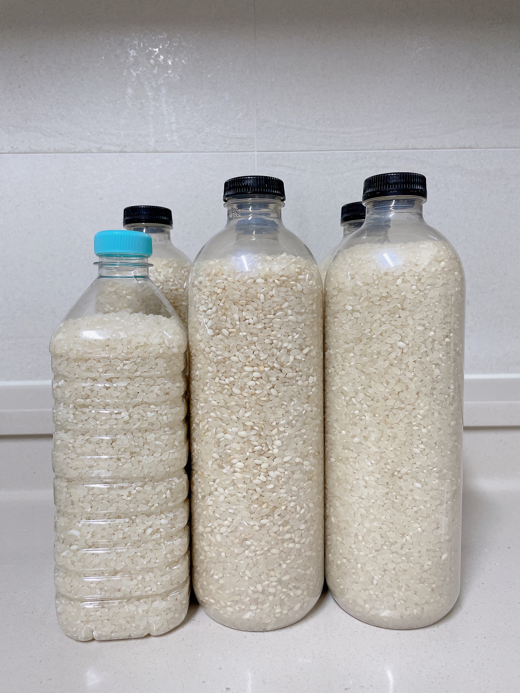 이렇게 보관하면 쌀이 변질되지도 않고 벌레가 생기지도 않아요. 무엇보다 소분되어 있으니 하나씩 씽크대 위에 두고 밥을 해먹기도 정말 좋습니다. 시중에 있는 플라스틱 쌀통을 사기보다는 버려질 페트병을 이용하면 좋은것 같아요 ^^