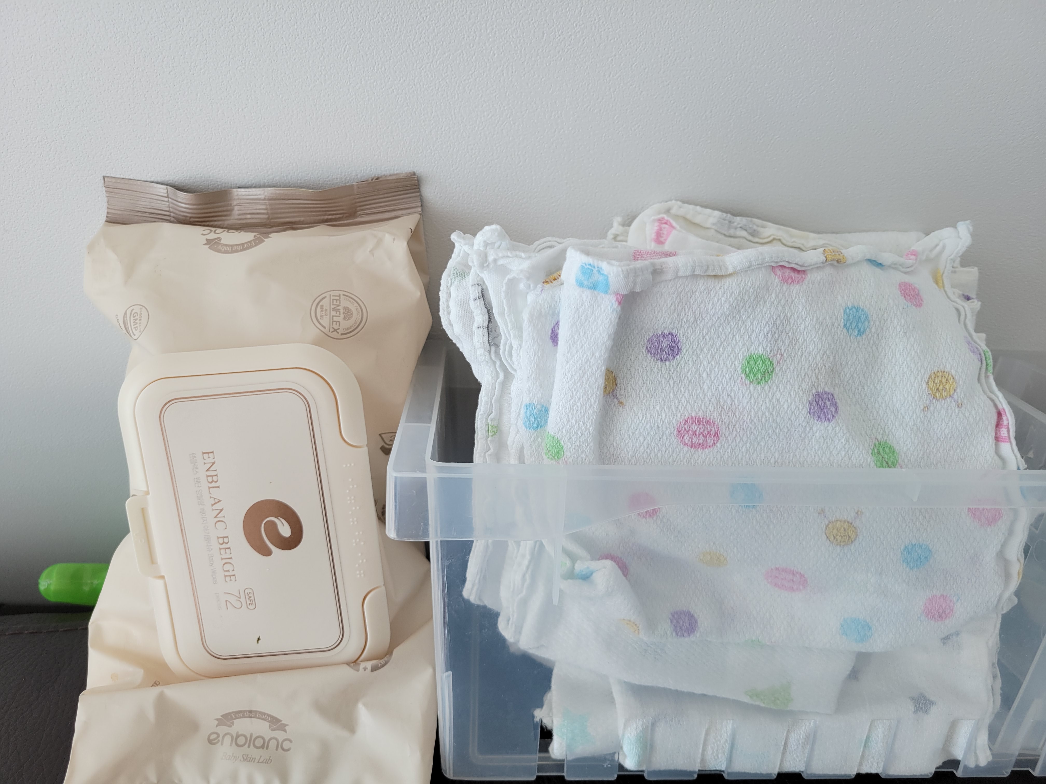 물티슈는 아주 꼭 필요할때만 가끔 한장 쓰고 평소에는 가제수건을 사용해요 물티슈에도 방부제가 들어있어서 아이에겐 좋지않다더라고요 환경도 생각하고 아이도 생각해서 가제수건!