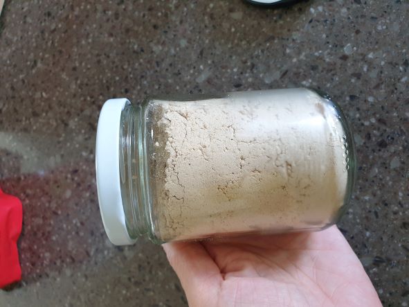 쨈을 다 먹고나서 유리병을 씻어두었어요. 지퍼백에 들어있던 귀리가루를 옮겨 담았더니 매번 지퍼백 열고 닫고 하지 않아도 되어서 사용하기 편하네요.