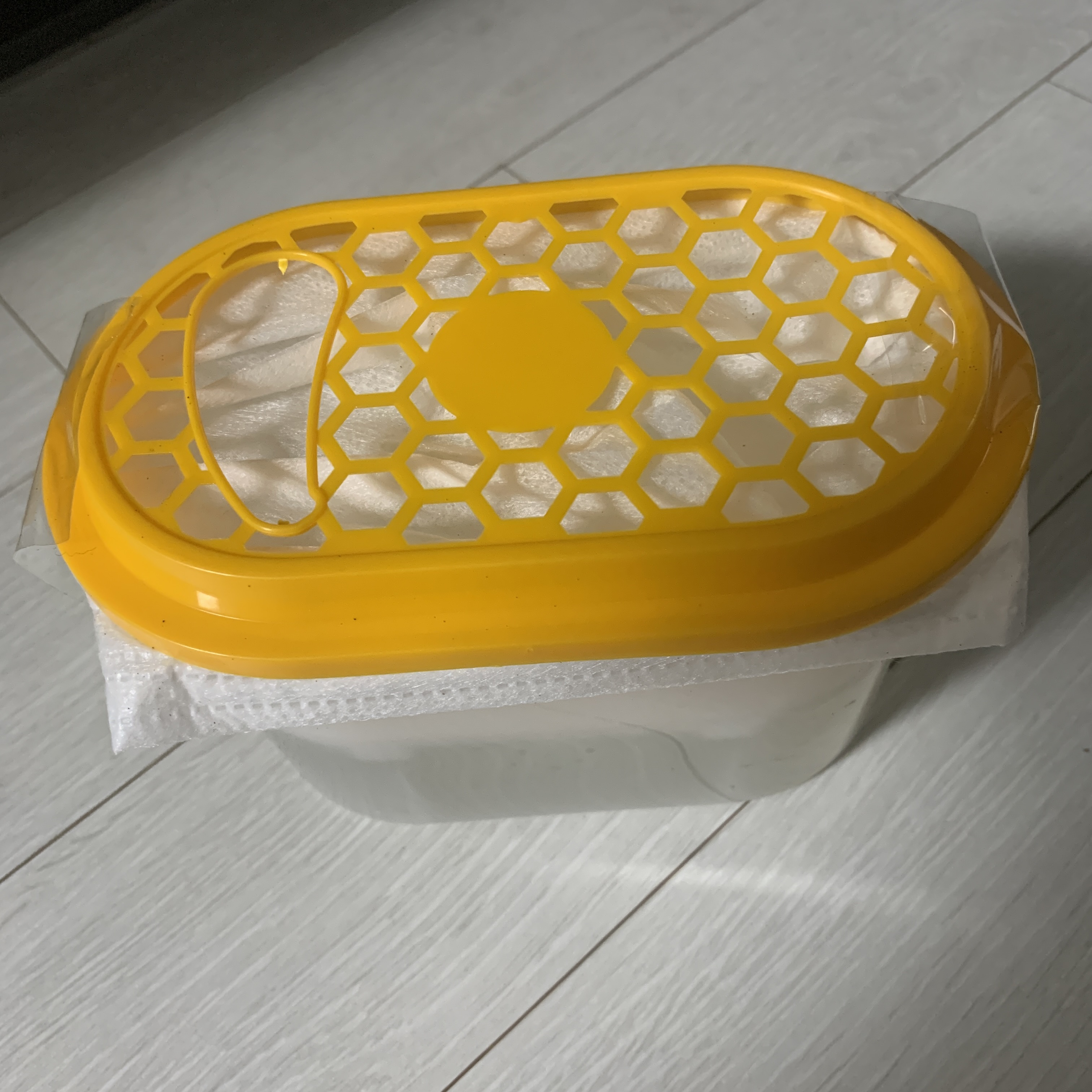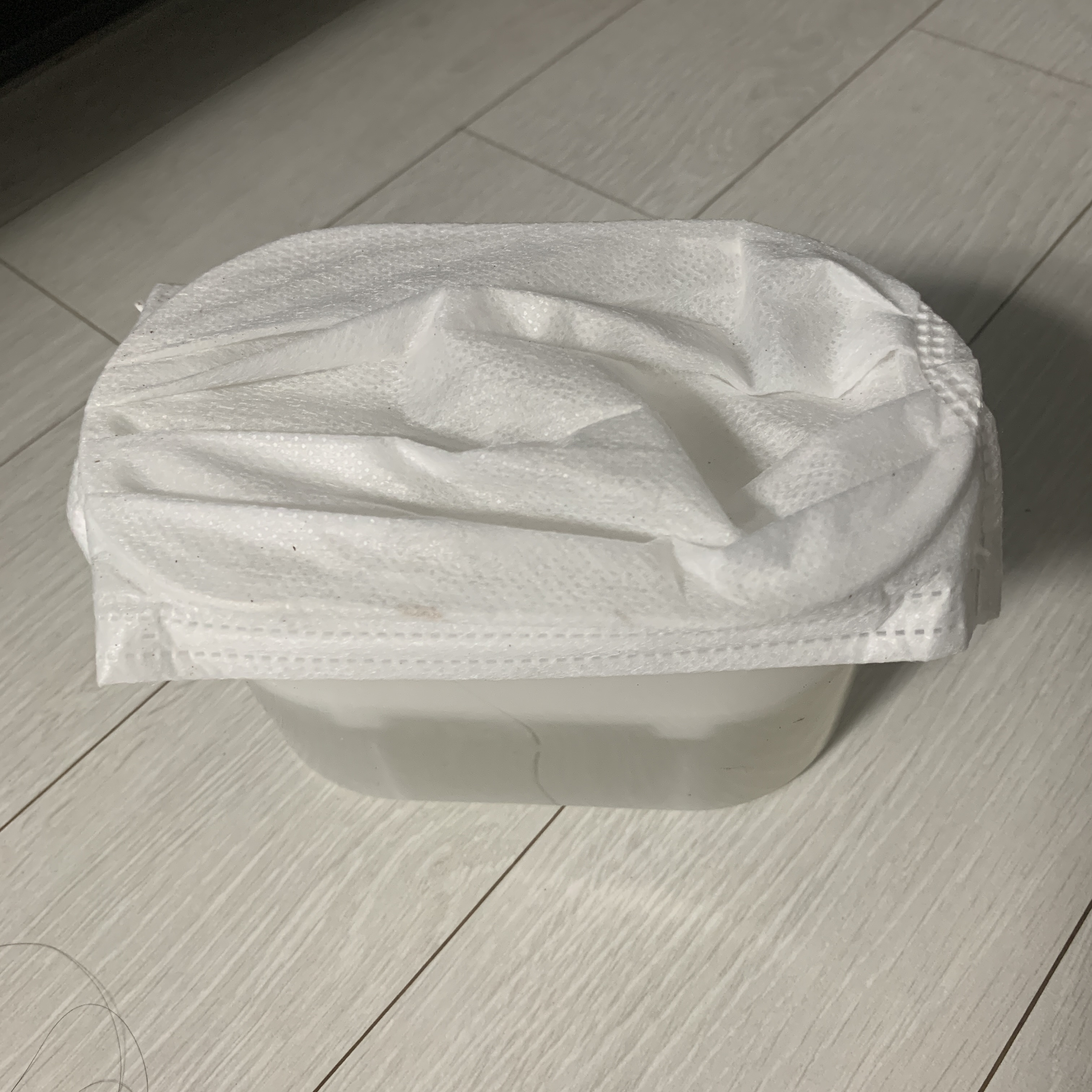 원래 통의 위쪽 막을 찢어서 있던 물을 버리고, 헹구고, 말려서 염화칼슘을 부어줘요. 저는 너무 얇아서 못 쓰고 있던 마스크를 덮개로 사용했어요! 효과는 동일해요~