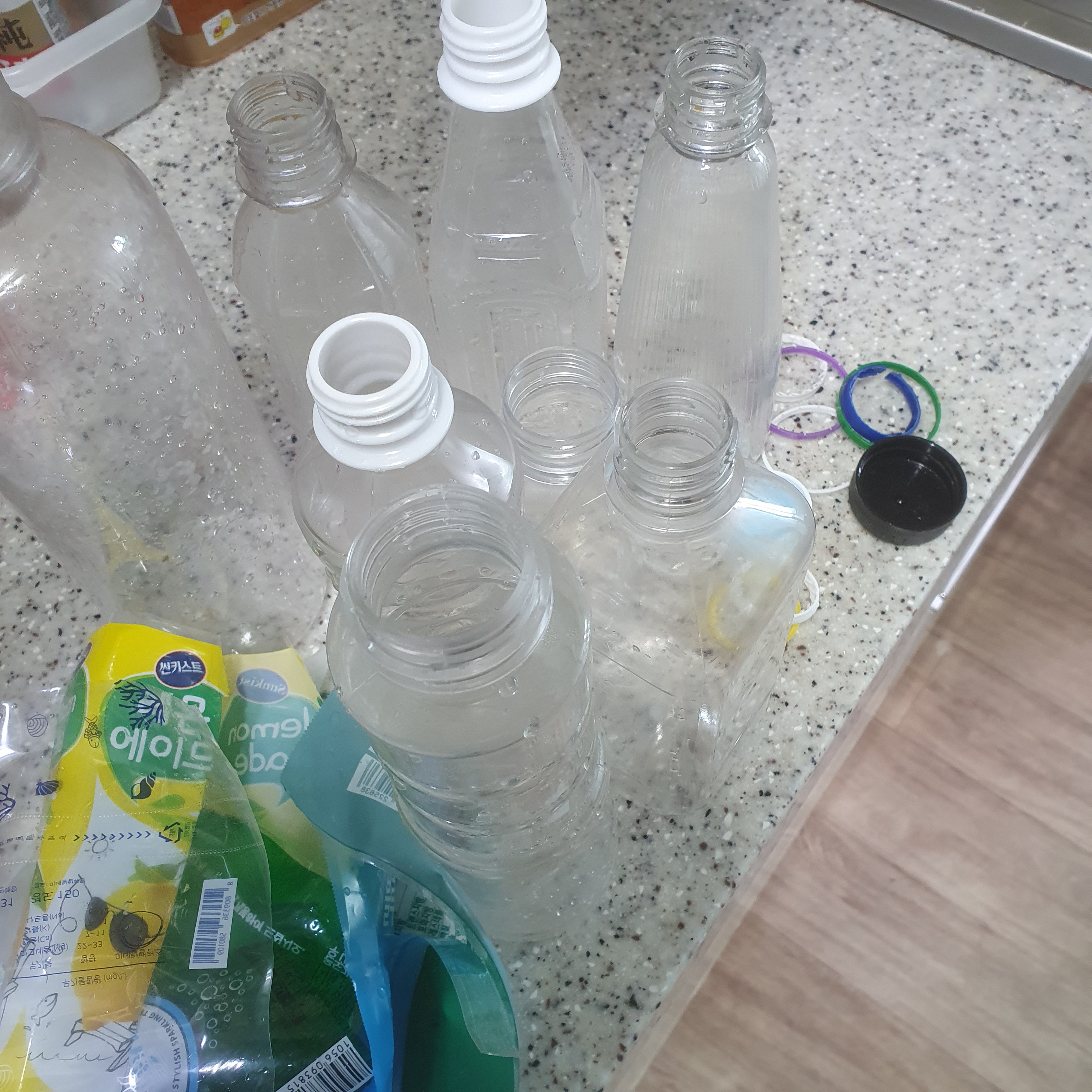 폐트병 분니배출위해 라벨과 병목걸이제거