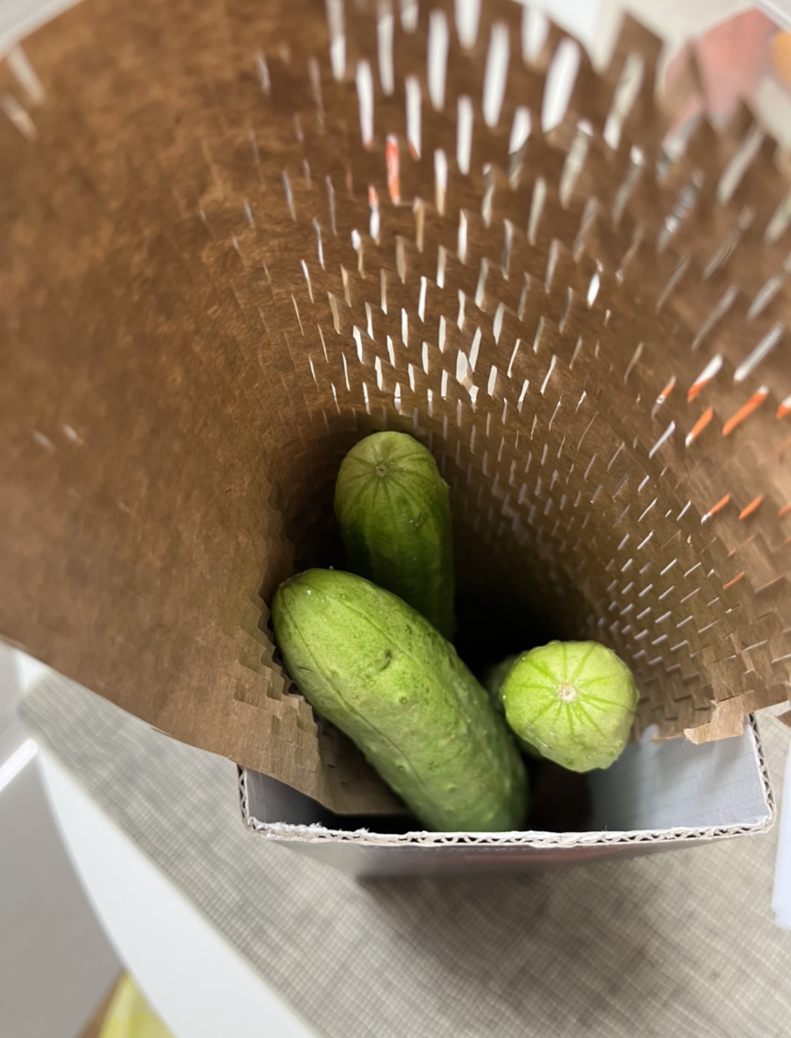 포장재로 흔한 크래프트는 야채 보관시 활용하면 좋아요. 오이나 시금치등 감싸 세워 보관하면 신선함이 오래