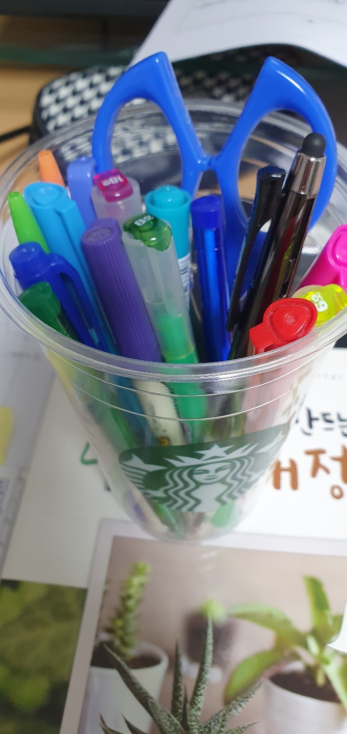 플라스틱 컵을 버리자니 찜찜하고 그래서 잘 씻어 말려서 요렇게 잡다한 사무용품과 필기구들 정리해 봤더니 투명해서 찾기 쉽고 정리되어 좋아요~~ 나름 알록달록 예쁘네요 ㅎㅎ