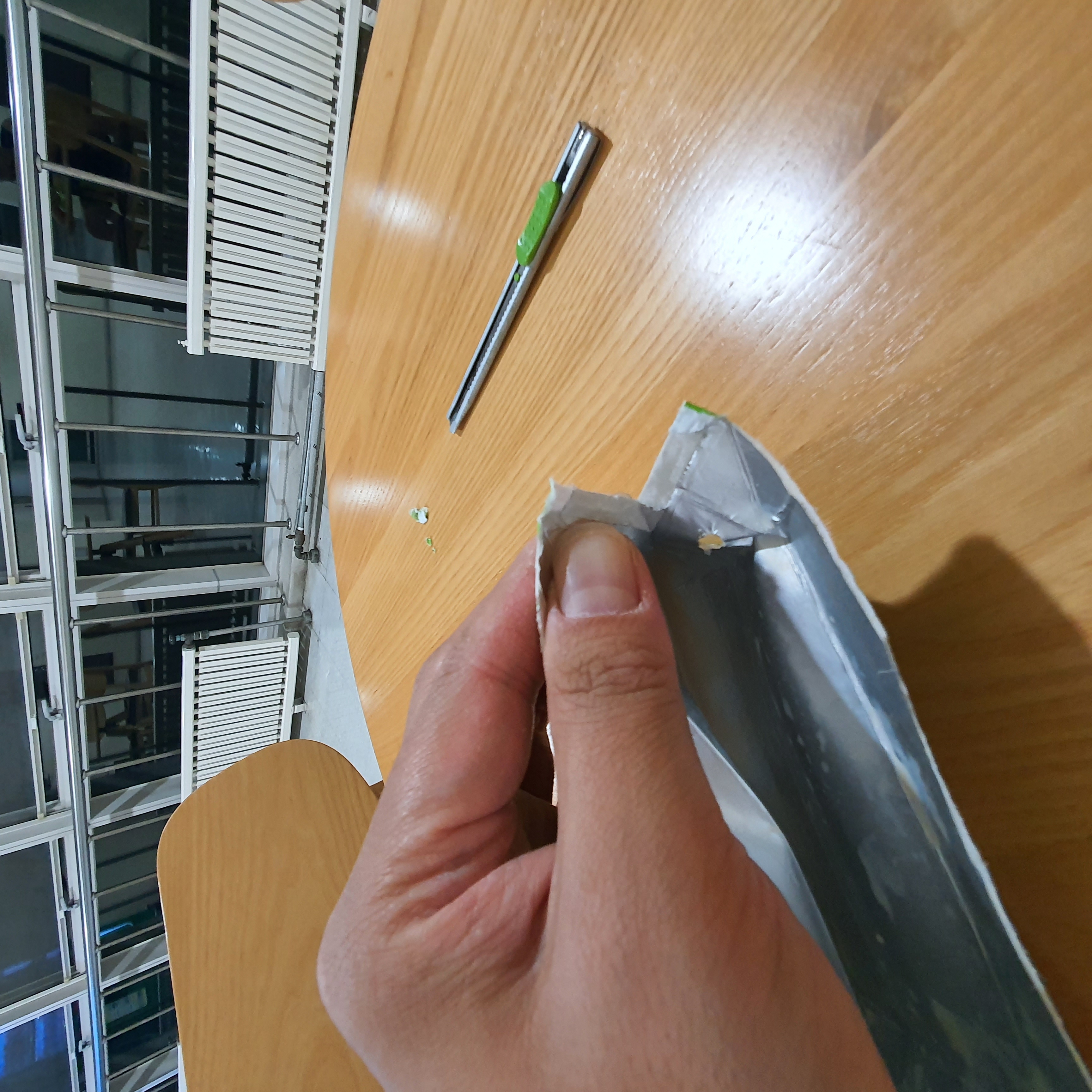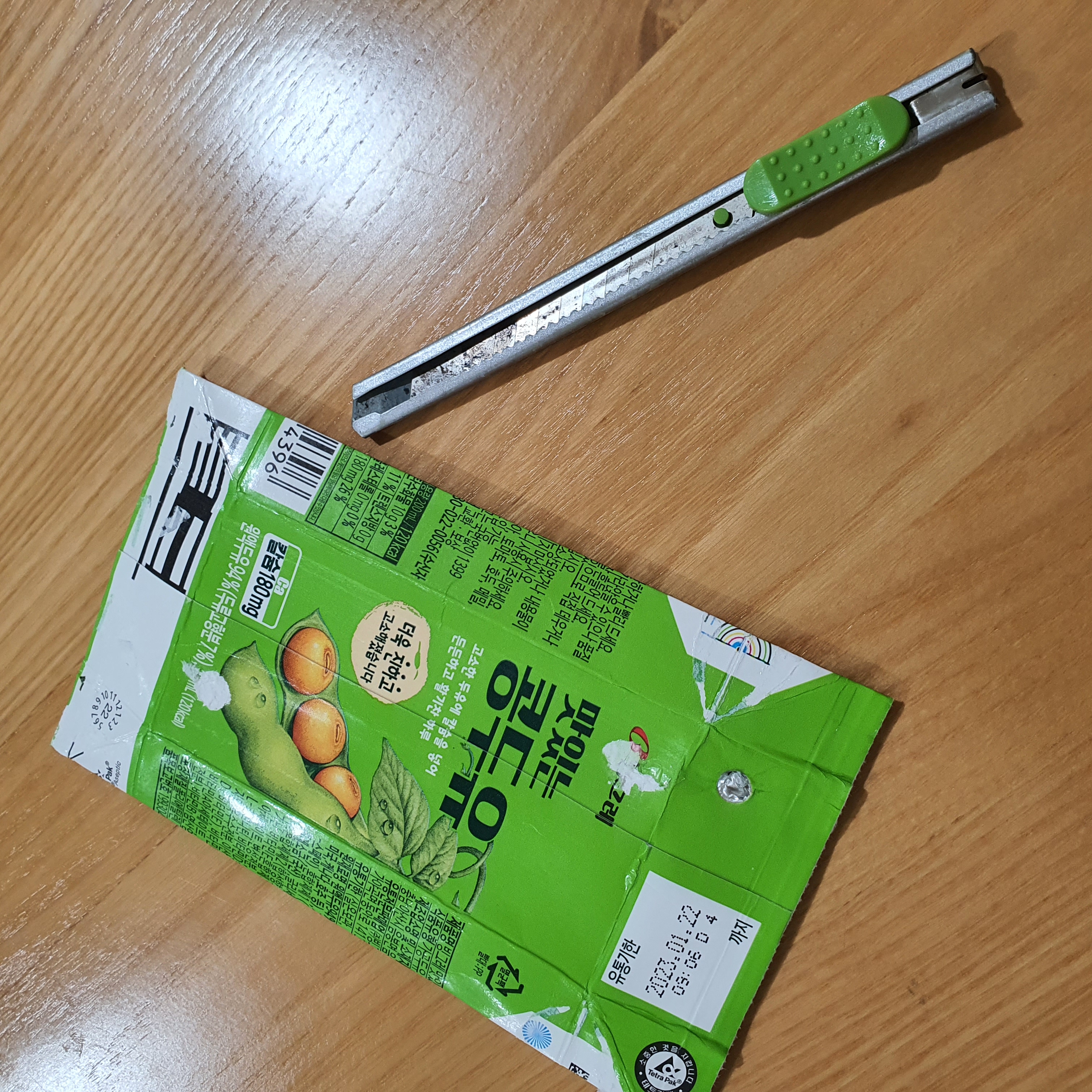 커터칼 바깥부분으로 두유팩 테두리를 납작하게 눌러주세요