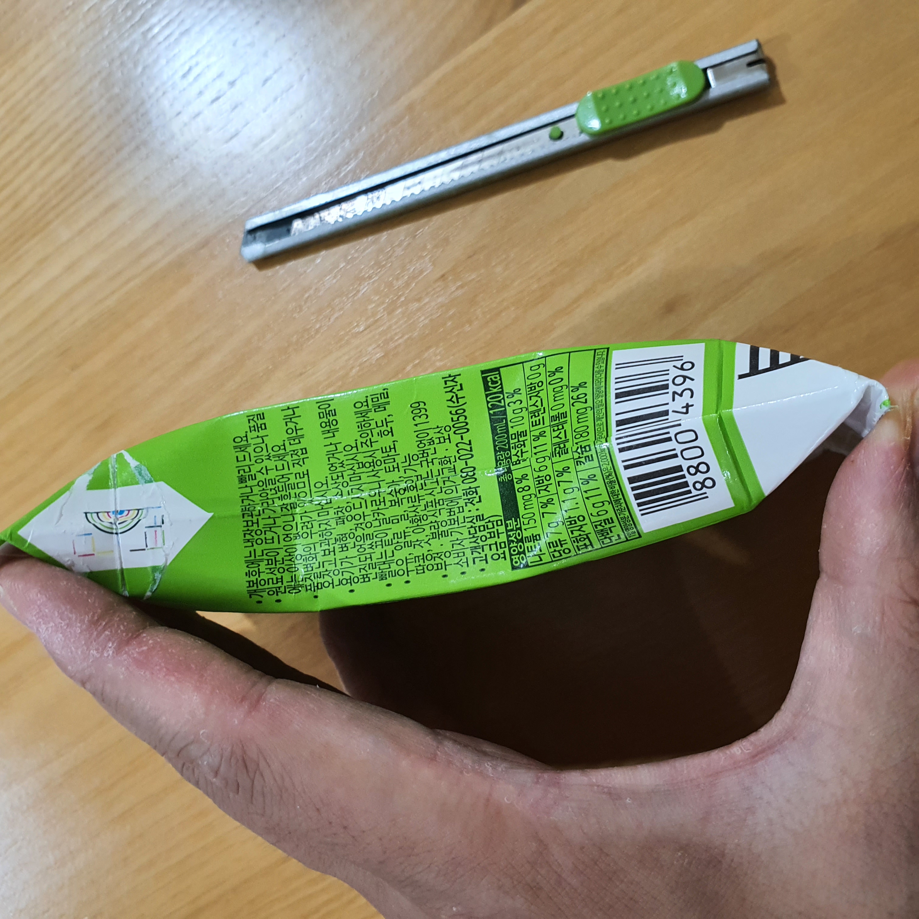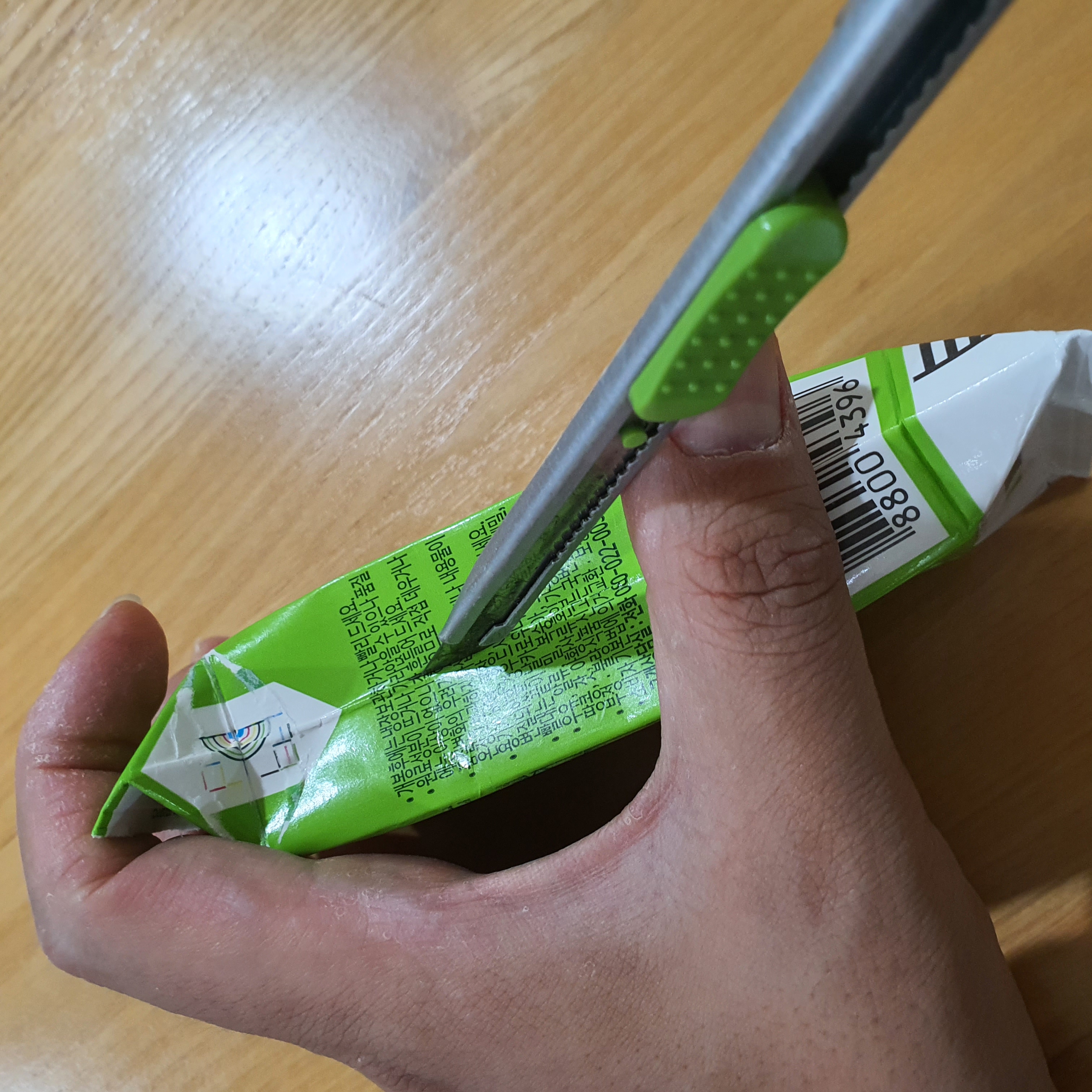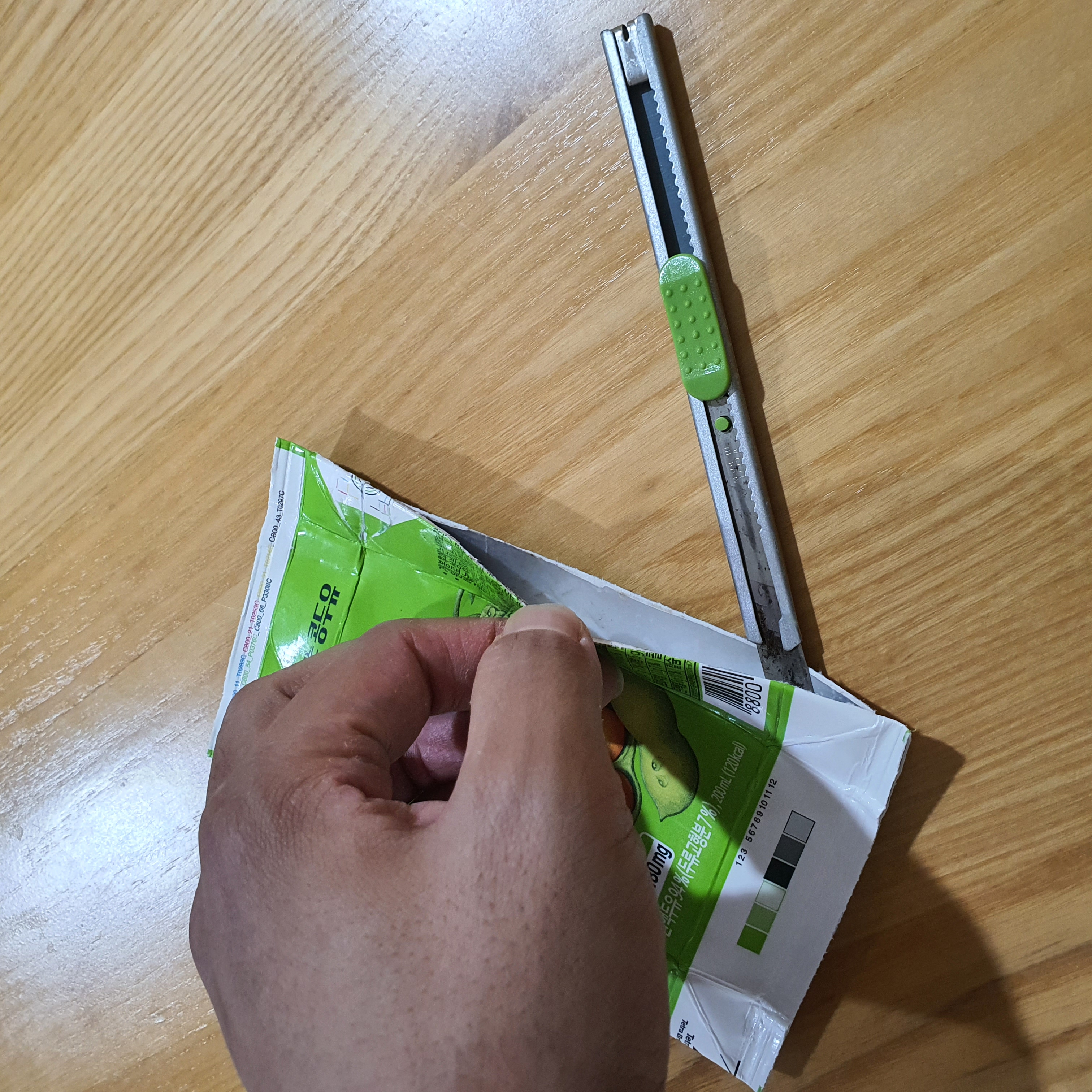 조금의 틈이 생기면 두유팩을 바닥에 놓고 위쪽 끝까지 자릅니다.