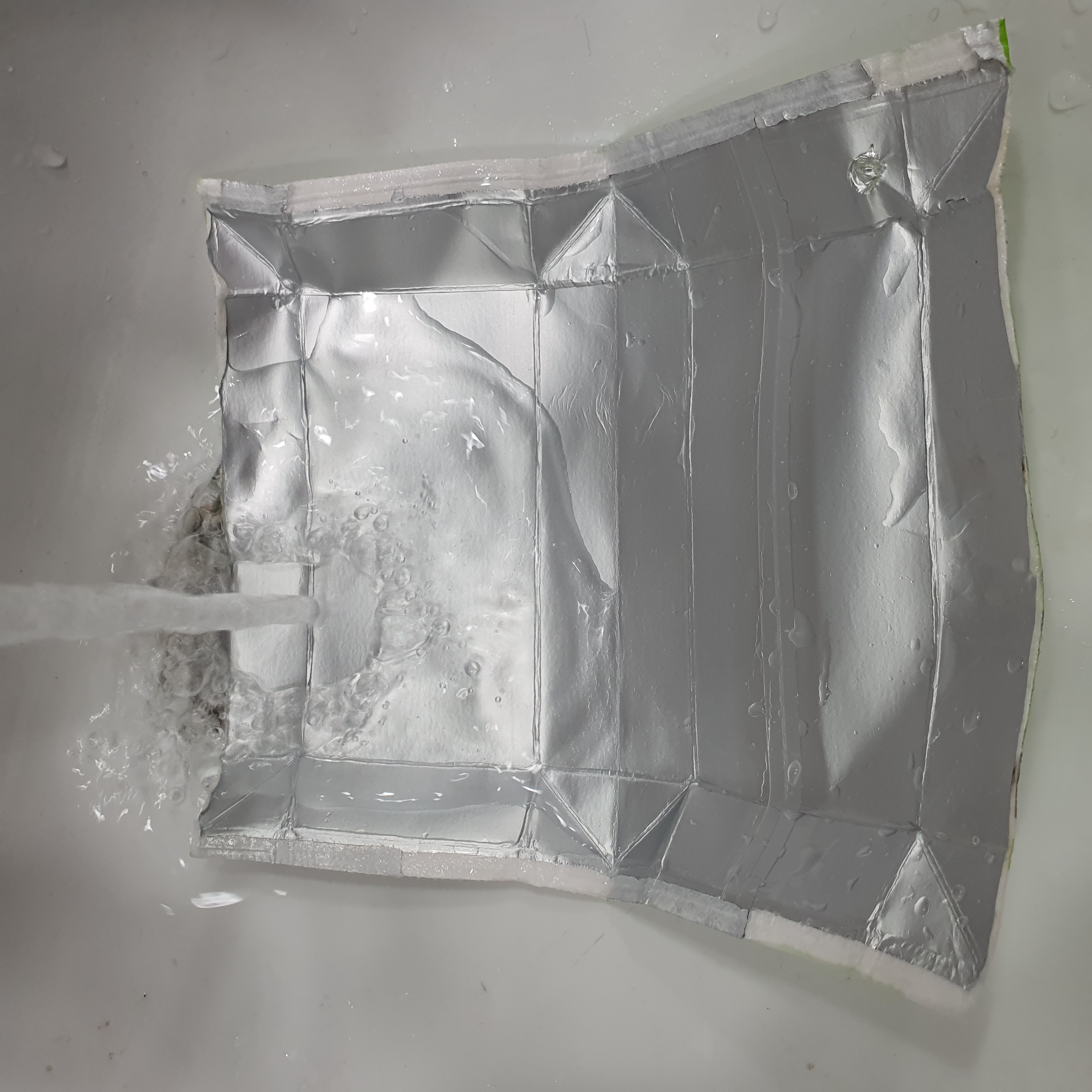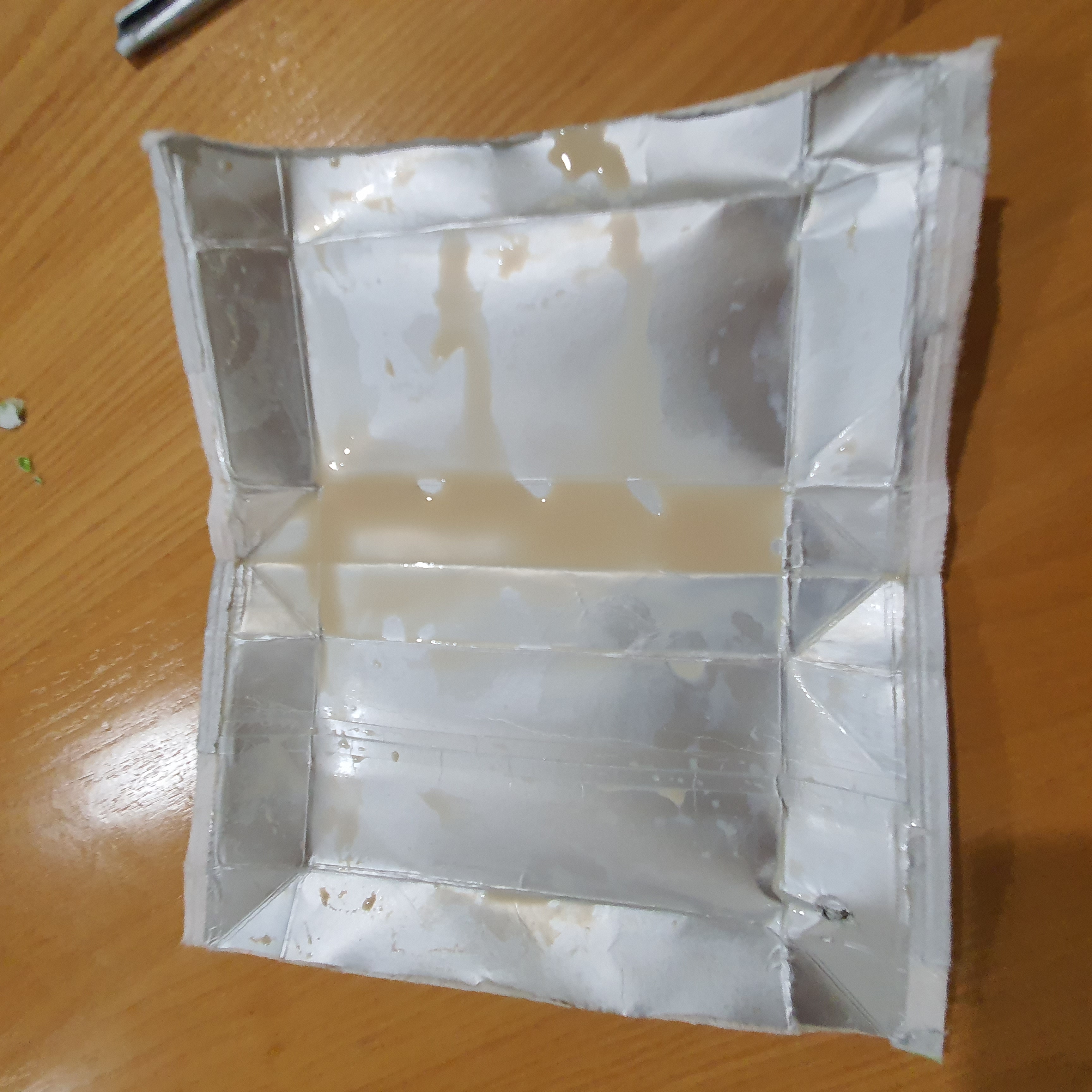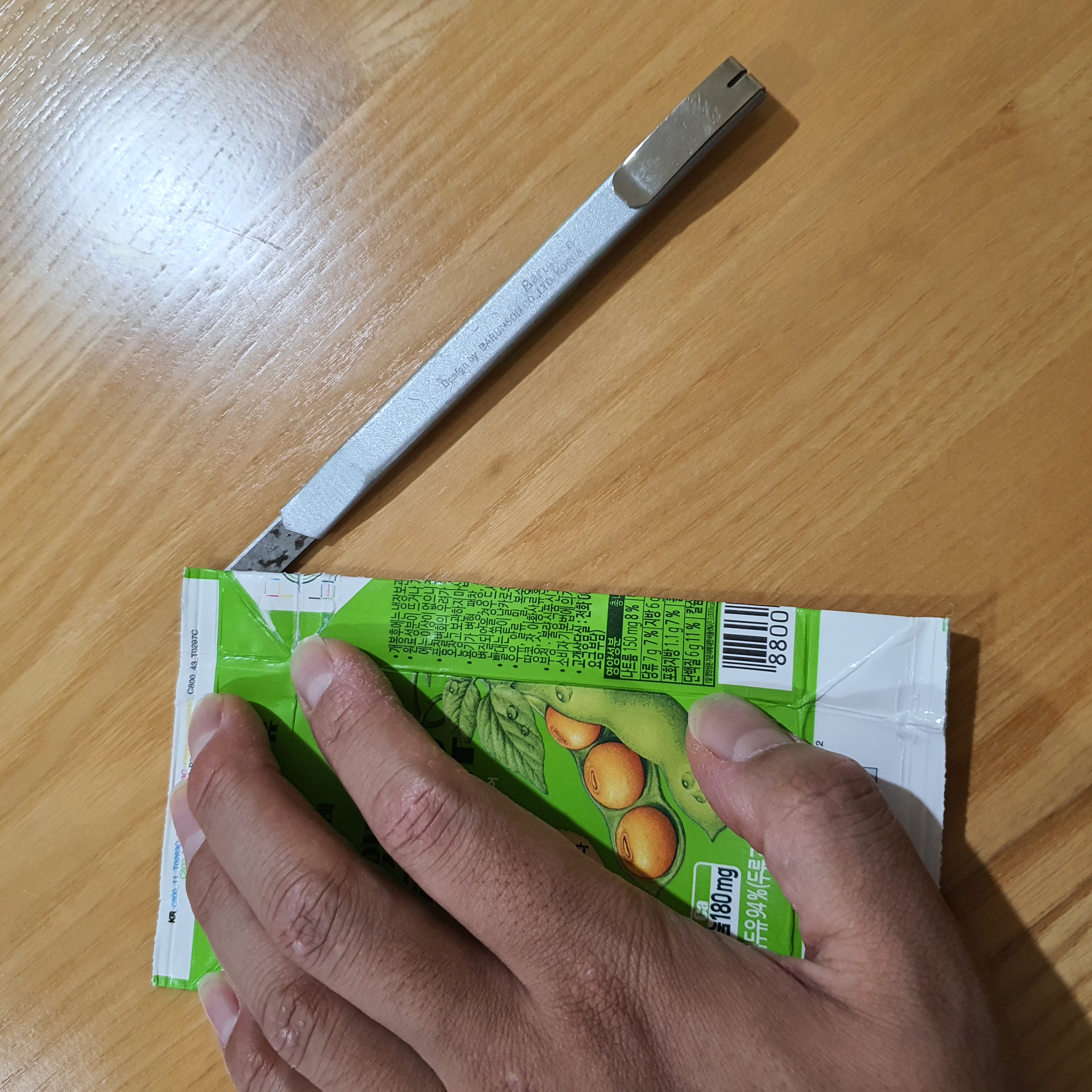 실리콘 제거 후 접힌 두유팩을 펼쳐줍니다.