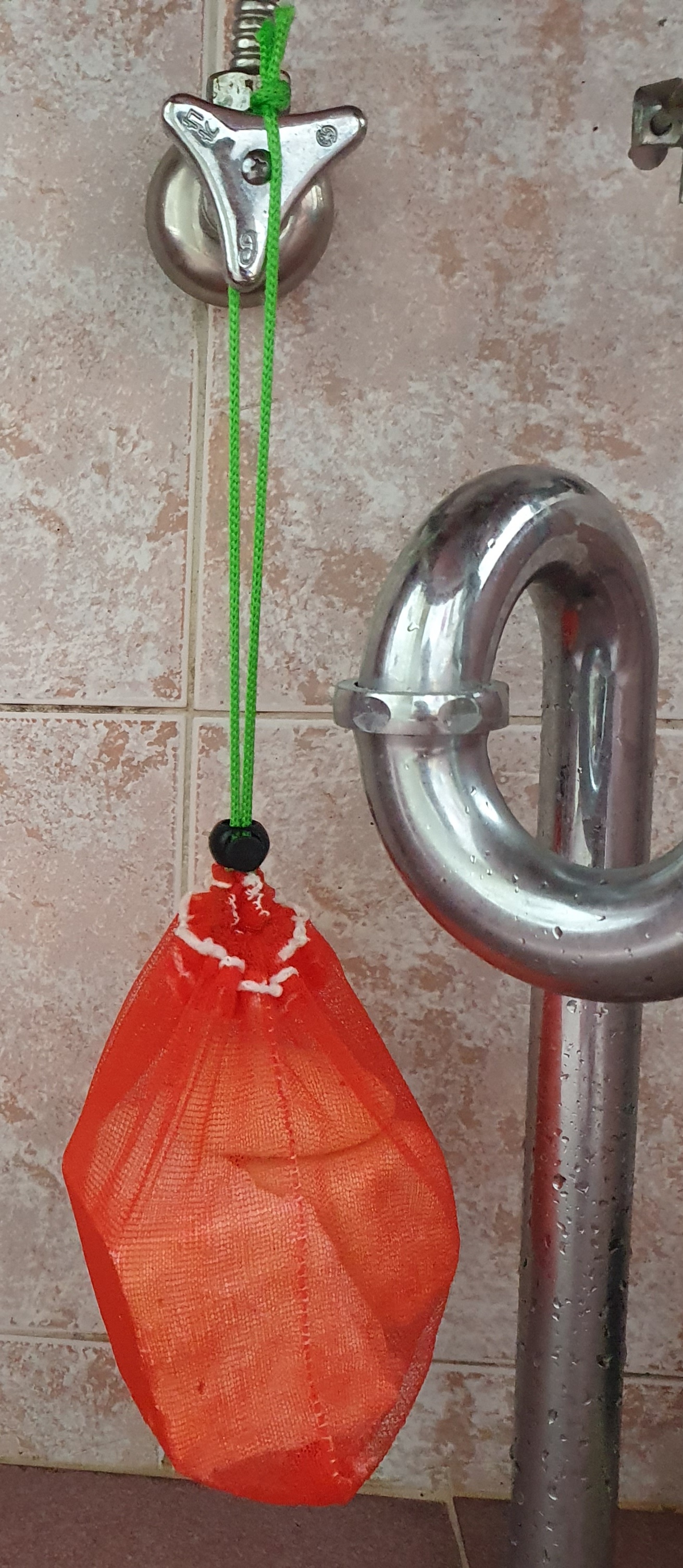 불편하던참에 양파망을 두겹으로해서 튼튼하게 손바느질하고, 줄과 버려지는 부속 하나를 활용하여 조임과 트임으로, 비누조각을 쉽게 모아 빠지지 못하도록해서 쓰임이 편하도록 만들었어요.