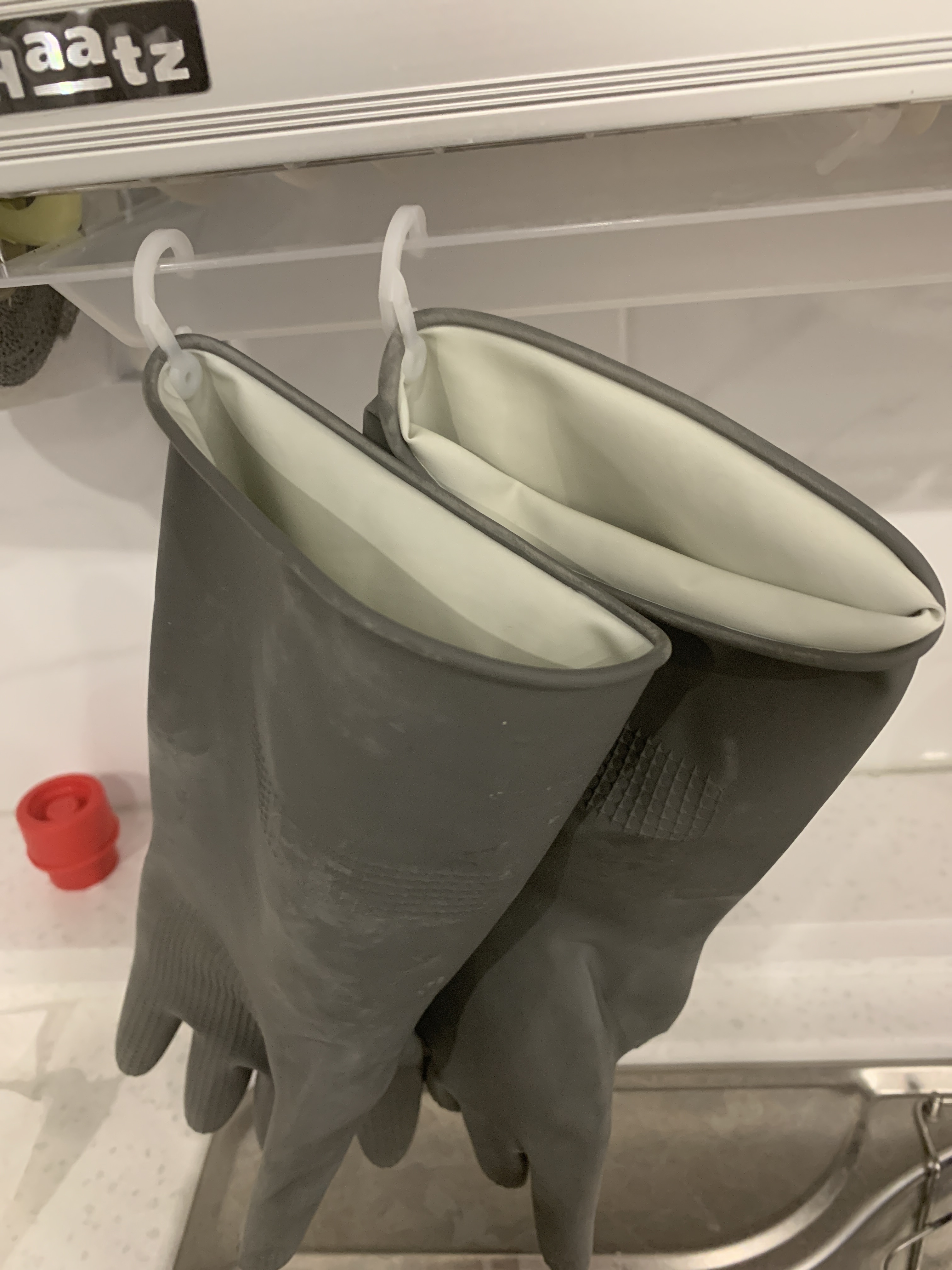 예전에 옷이나 양말 사면 모아뒀던 걸 이렇게 활용하면 쓰레기 줄이고 고무장갑도 걸고! 일석이조!!