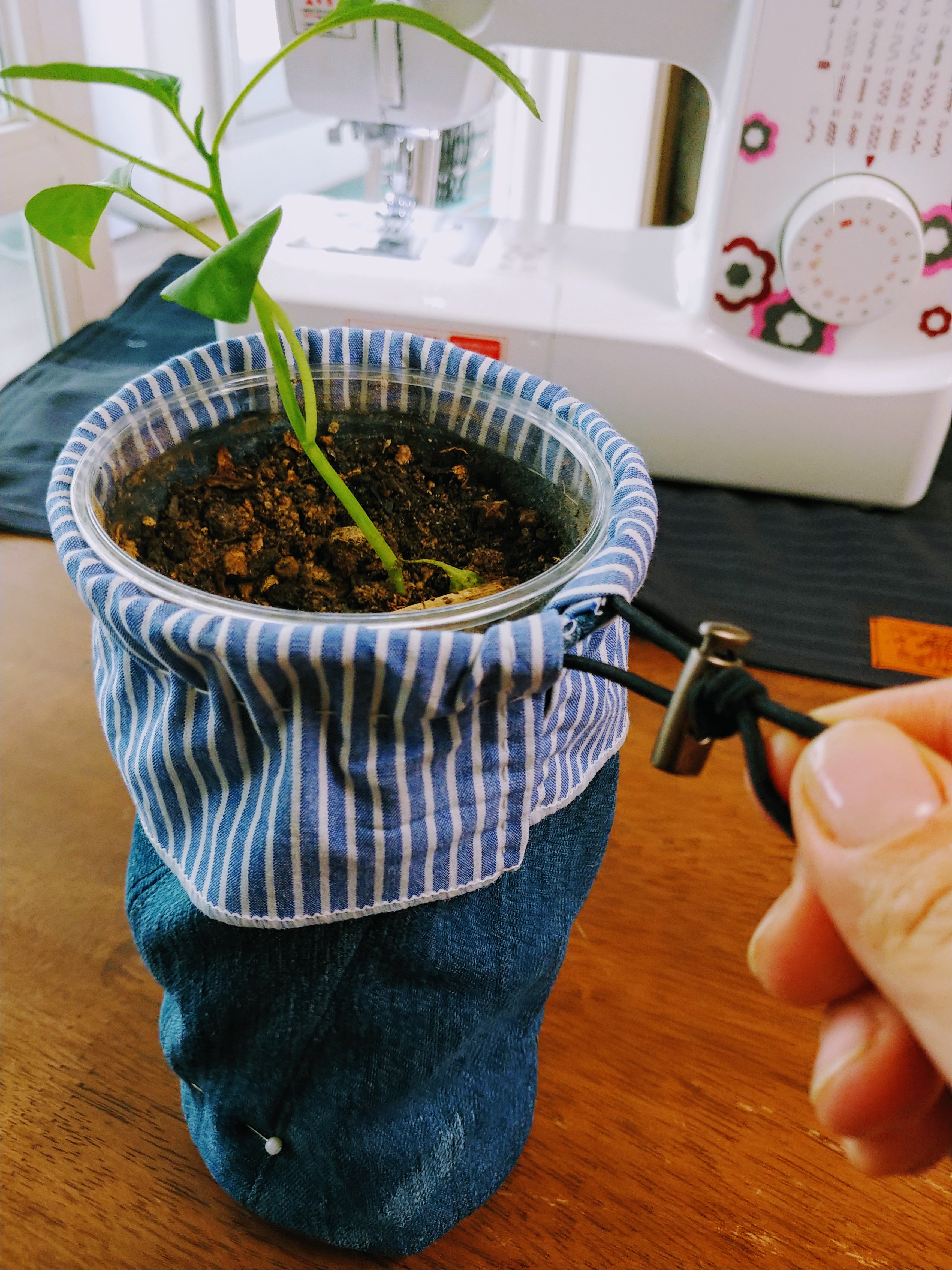 구멍난 청바지와 수선하고 남은 천으로 화분 커버 만들었습니다. 만들어 쓰면 소비하고자 하는 욕구가 줄어들어요.