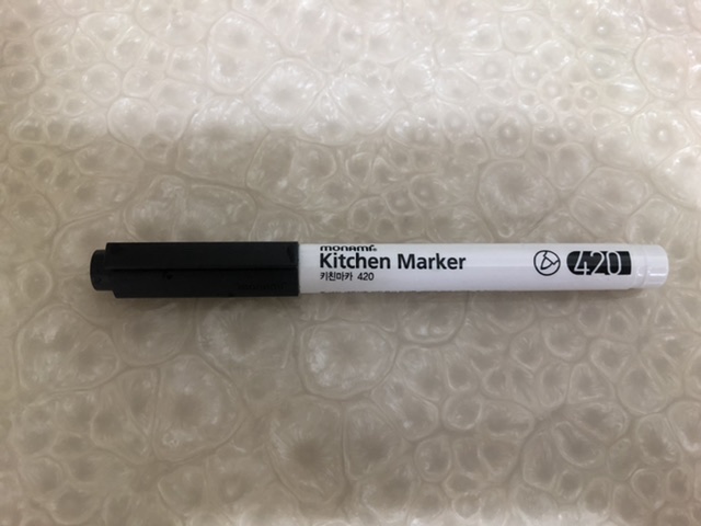 네임펜처럼 생겼는데 병, 플라스틱에 적고 씻을 때 지워지는 펜이에요~
