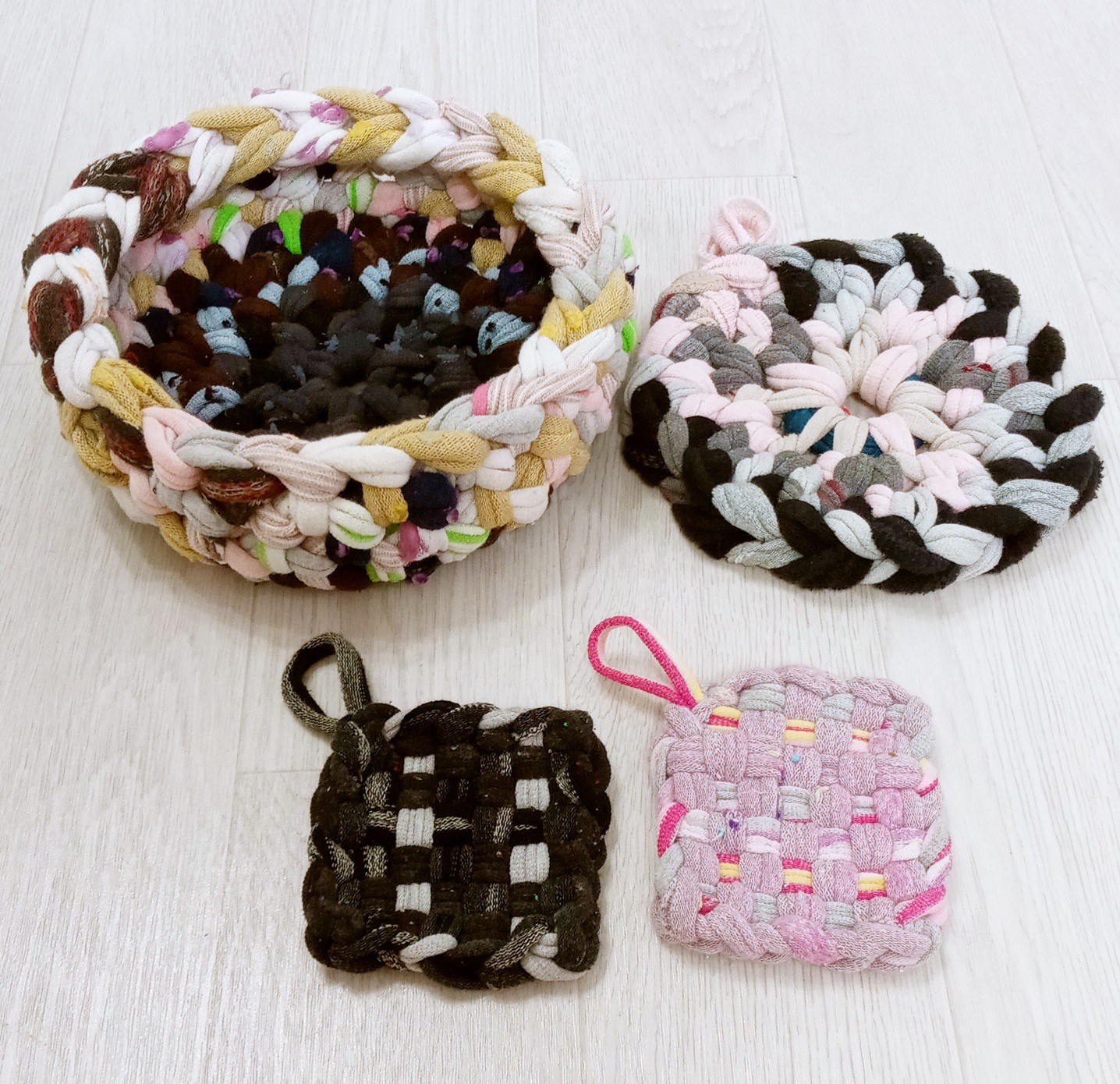 약 넣는 바구니, 냄비받침, 티매트2개 만들어 봤습니다. 양말목 재활용입니다.