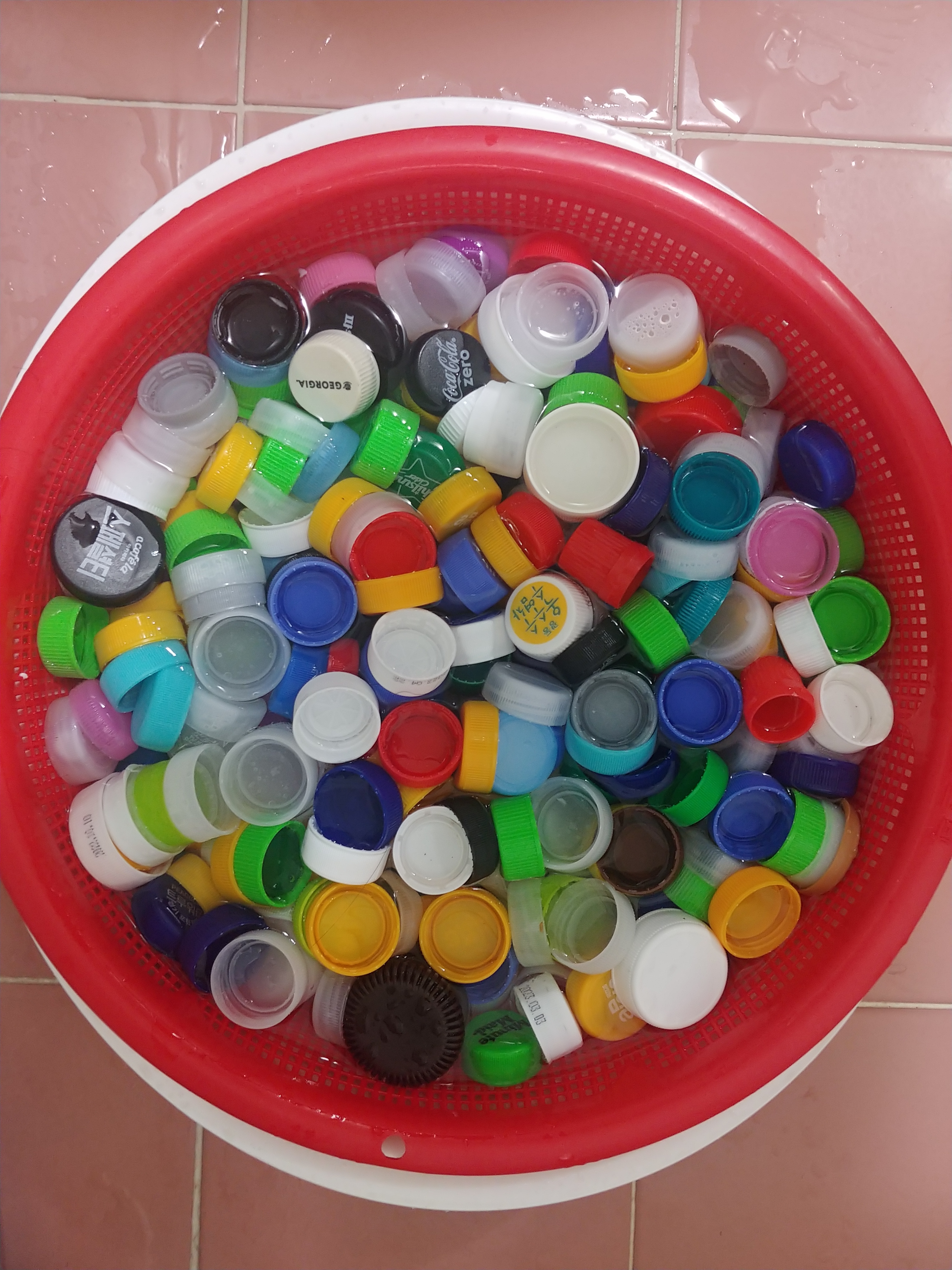 대야위에 체반얹어서 병뚜껑 뜨거운 물에 담가놓았어요.