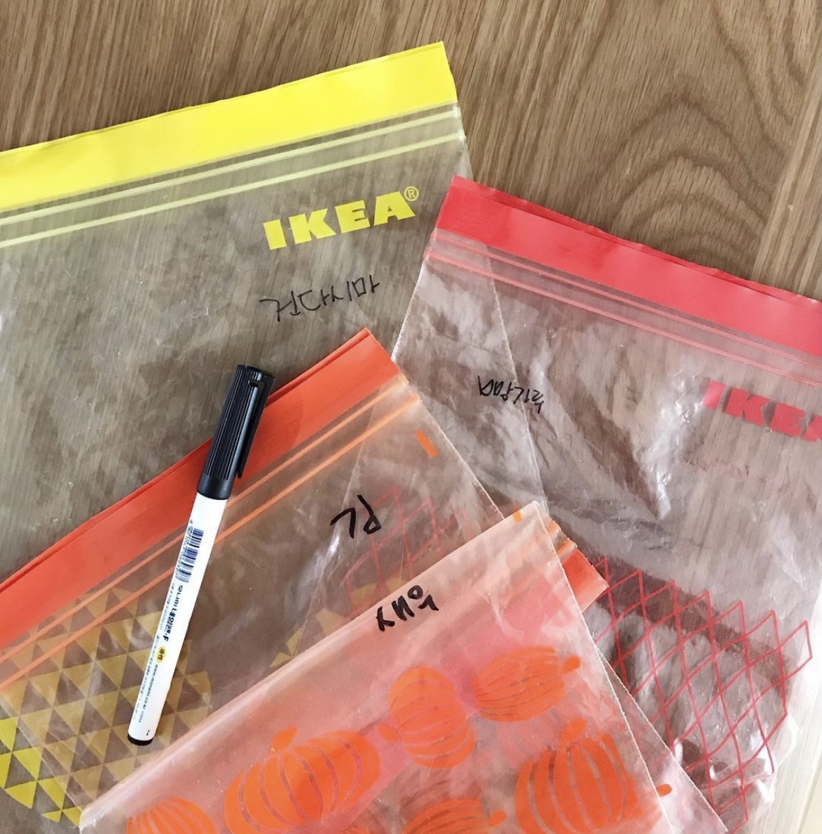 물기없는 재료를 넣거나 상태가 좋은 비닐은 용도를 네임펜으로 적어두고 계속 사용하기. 수명이 다할때까지 사용하고 또 사용하기. 결국엔 비닐용품 사용 최소화하기가 목표입니다!! ^^